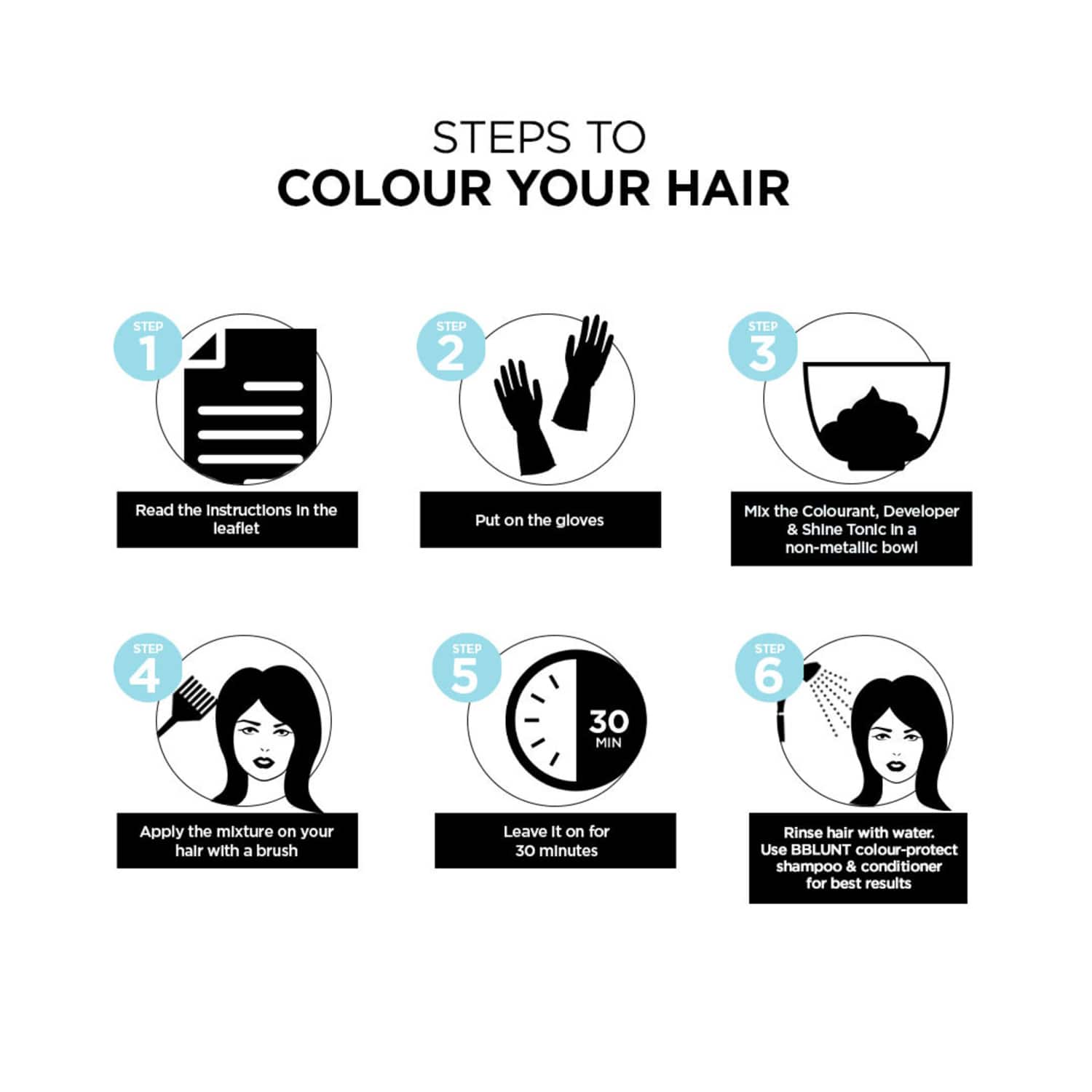 Get damage-free hair with the BBlunt Salon Secret High Shine Cream Hair Color - 03 Chocolate Dark Brown (100g+8ml). This nourishing hair color helps lock moisture in your hair, protecting it from damage. It is a long-lasting hair color that stays up to 8 weeks. The BBlunt hair color is a grey-covering hair color ideal for enhancing the shine of your hair.Key Features & Benefits:Enriched with silk protein to add luster to your hairImproves the moisture balance of your hair to add smoothnessHair protecting color shields hair from damageFree from ammonia, SLS, and parabens for safe useKey Ingredients:Silk protein: Enhances the shine of your hairHow to Use:Wear the gloves provided with the pack. Pour the mixture into a metallic bowl. Apply the mixture to dry hair with a brush, and spread evenly. Leave it for 30 minutes and wash it off with water.All Ingredients:Colourant (Type 3): Paranum Liquidum, Aqua(Water), Ethanolamine, Steareth-21, Steareth-2, Resorcinol, P-Phenylenediamine, Cetearyl Alcohol, Trideceth-2 Carboxamide Mea, P-Aminophenol, M-Aminophenol, 2, 4-Diaminophenoxyethanol Hcl, 2-Methylresorcinol, Xanthan Gum, Polyquaternium-22, Ceteareth-20, Sodium Sulphite, Ascorbic Acid, Disodium Edta, 1-Hydroxyethylidene-1, 1-Diphosphonic Acid Disodium Salt, Sodium Metabisulphite, Phenyl Methyl Pyrazolone, Parfum.Developer: Aqua (Water), Paranum Liquidum, Hydrogen Peroxide, Cetearyl Alcohol, Glyceryl Stearate, Peg-100 Stearate, Polyquaternium-39, Sodium Stannate, Phosphoric Acid, Tetrasodium Pyrophosphate, Sodium Laureth Sulphate, Sodium Salicylate, Disodium Edta, Ceteareth-20.Shine Tonic: Aqua (Water), Glycerin, Hydroxyethylcellulose, Polyquaternium-22, Peg-12 Dimethicone, Silk Amino Acids, Methylchloroisothiazolinone, Methylisothiazolinone, Magnesium Chloride, Magnesium Nitrate, Sodium Hydroxide.About the Brand:Founded in the early '90s, BBlunt has an unrivaled understanding of Indian trends, colors, styles, and fashion. With years of experience and expertise in hair related products, they believe that copy-paste is not an option. They get inspiration from people who love expressing their individuality with their hair and are not afraid to experiment. BBLUNT continues to be a trendsetter. BBlunt manufactures hair colors, shampoos, dry shampoos, conditioners, styling products, serums, and temporary hair colors. Hard water is rich in minerals that cause hair loss. BBlunt hair care products are specially developed to protect Indian hair. They have developed a range of products to rejuvenate hair and protect it from hard water and pollution. Their products leave your hair soft, shiny, and manageable.