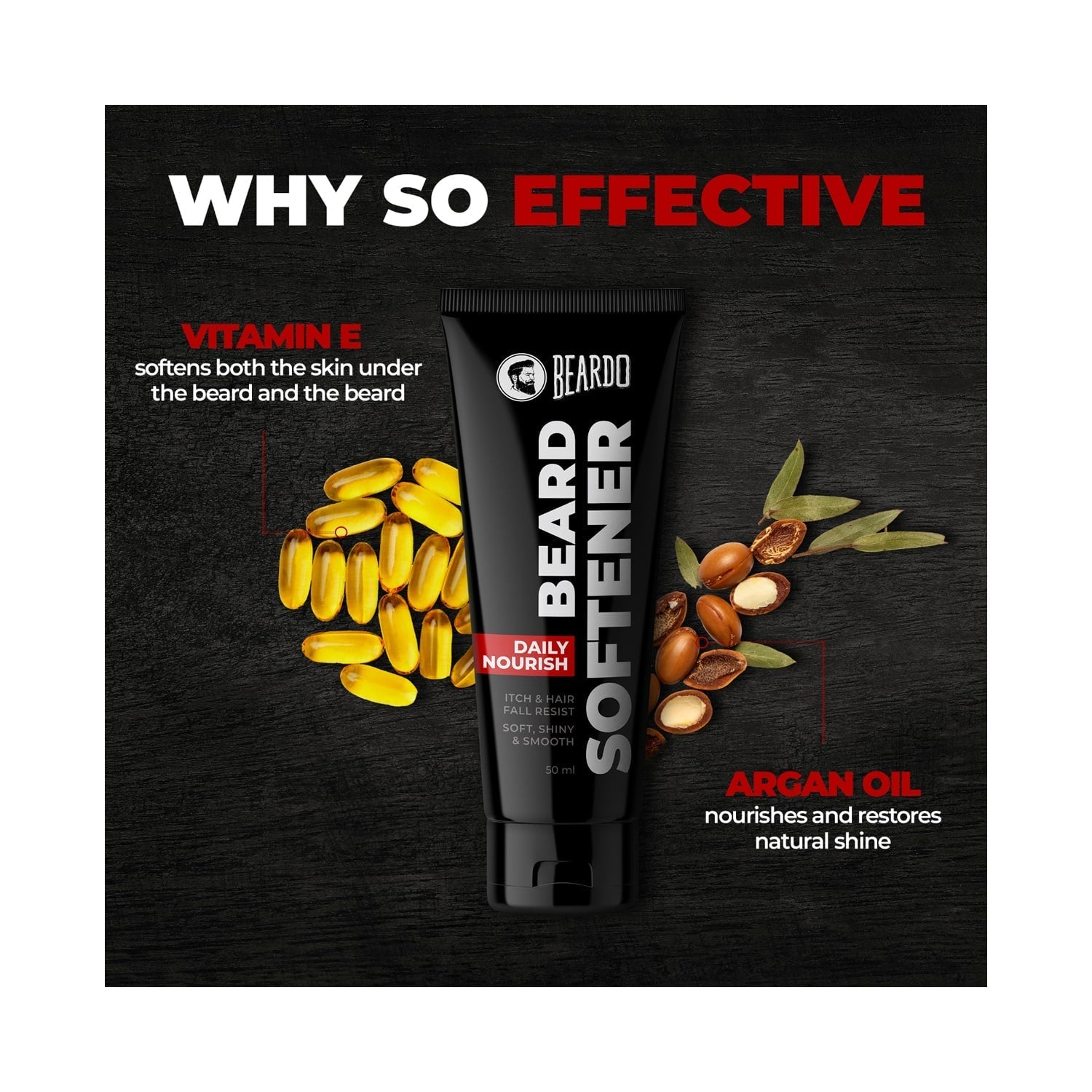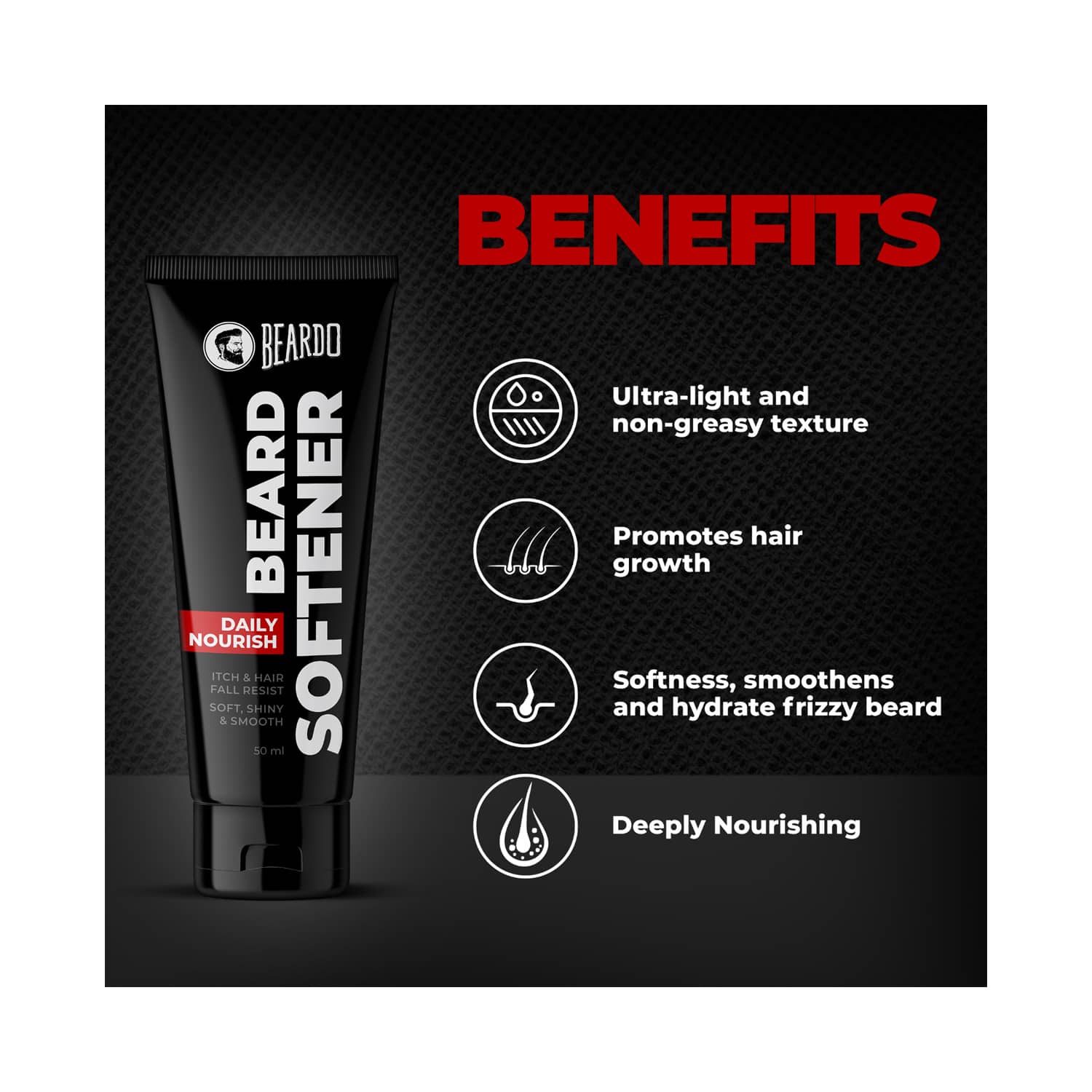 Supercharge the health of your beard with the Beardo Daily Nourish Beard Softener (50ml). This moisturizing beard softener is infused with vitamin E and argan oil to condition and smoothen the beard and revitalize its natural shine. Also, this Beardo beard softener has an ultra-light formula that does not leave behind any greasy residue. Plus, it soothes skin irritation and itchiness and promotes hair growth.Key Features & Benefits:Enriched with vitamin E and argan oil to nourish and softenMoisturizes the beard and mustache to revitalize its shineUltra-light formula does not leave behind any greasy residueSoothes skin irritation and itchiness and promotes hair growthKey Ingredients:Vitamin E: Softens the skin and beardArgan oil: Nourishes the beard and restores natural shineAll Ingredients:Demineralized Water, Light Liquid Paraffin, Dimethicone, Cetearyl Alcohol (And) Dicetyl Phosphate (And) Ceteth- 10 Phosphate, Cyclopentasiloxane, Undecane (And) Tridecane, Petroleum Jelly, Cetyl Esters, Argan Oil, D-Panthenol, Fragrance, Sodium Acrylates/ Beheneth-25 Methacrylate Crosspolymer (And) Hydrogenated Polydecene (And) Lauryl Glucoside, Cetrimonium Chloride, Phenoxyethanol, Vitamin E.How to Use:Take a small amount of the cream in your palm. Then, apply the cream to your clean, dry beard. Spread it thoroughly through your beard and mustache.About the Brand:Based in Ahmedabad, Gujarat, Beardo comes from a lack of options for discerning urban men who want to grow and maintain their beards but have no choice but to use regular oils and incompatible products. Beardo uses the finest materials and quality-controlled manufacturing processes to ensure that your bearded man's facial mane is pampered, soft, lustrous, and flawless. They provide the products you need. Beardo is not only a beard care expert focusing exclusively on beard care products but also a men's skincare line that includes scrubs, moisturizers, masks, body washes, serums, and more. They always try to create breakthrough products that are easy to use and effective for men.Check out more Beardo Beard Softener options here, or browse through tokocart's full range of Beard Softener from top global brands.You can also explore other products from the world of Beardo here on tokocart.