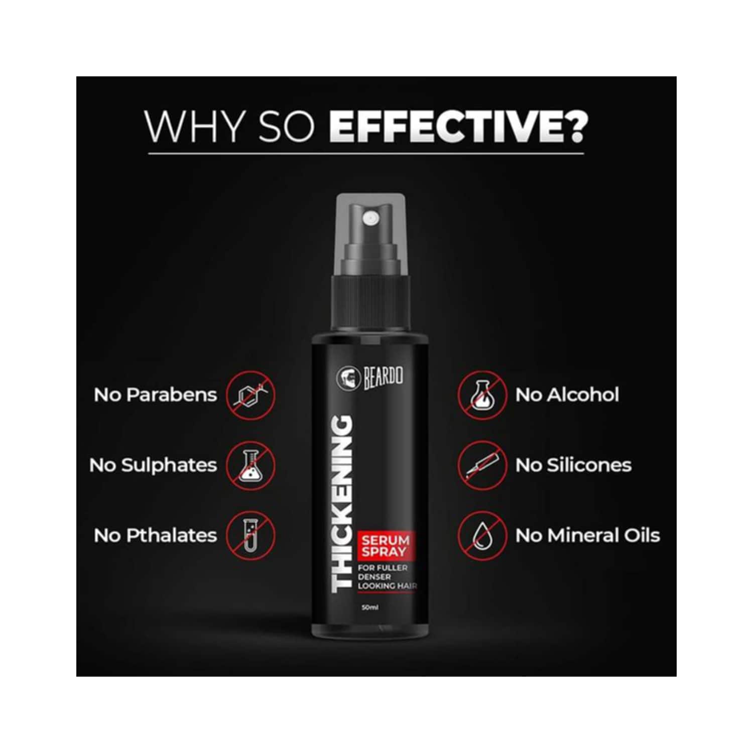 Get thicker, fuller hair in seconds with the Beardo Hair Thickening Serum Spray (50ml). This volumizing spray creates instant volume and thickness, eliminating frizz and nourishing dry hair. Natural ingredients in this hair serum spray make it a beneficial solution for your hair, and the ultra-nourishing properties of this Beardo hair serum keep it looking gorgeous all day long.Key Features & Benefits:Adds volume and thickness to hair instantlyEliminates frizz to give the hair a shiny, smooth appearanceUltra nourishing formula helps rehydrate dry hair and make it softMade from natural ingredients that are safe for use for all hair typesHow to Use:First, spray an adequate amount of the serum on damp hair. Comb the serum into the hair and style it the way you want.About the Brand:Founded in 2015 by Ashutosh Valani and Priyank Shah, Beardo comes from a lack of options for discerning urban men who want to grow and maintain their beards but have no choice but to use regular oils and incompatible products. At Beardo, they use the finest materials and quality-controlled manufacturing processes to ensure that your bearded man's facial mane is pampered, soft, lustrous, and flawless. They provide the products you need. Beardo is not only a beard care expert focusing exclusively on beard care products but also a men's skincare line that includes scrubs, moisturizers, masks, body washes, serums, and more. They are always trying to create breakthrough products that are easy to use and effective for men.Check out more Beardo Hair Stylings options here, or browse through tokocart's full range of Hair Stylings from top global brands.You can also explore other products from the world of Beardo here on tokocart.