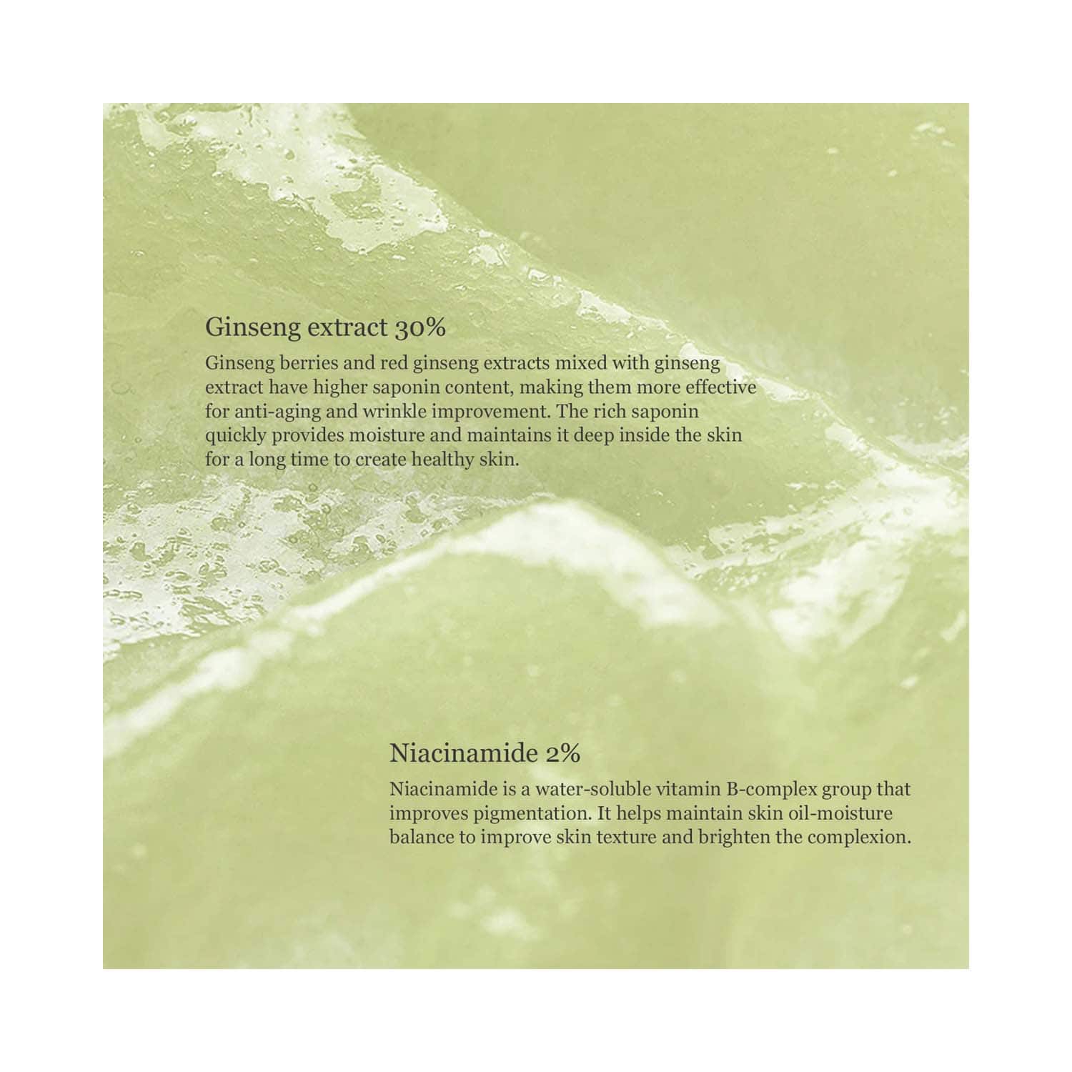 Key Ingredients:Ginseng root extract: Hydrates the skin deeplyNiacinamide: Balances oil and moisture level of the skinClear-fence capsule: Moisturizes and nourishes the skin