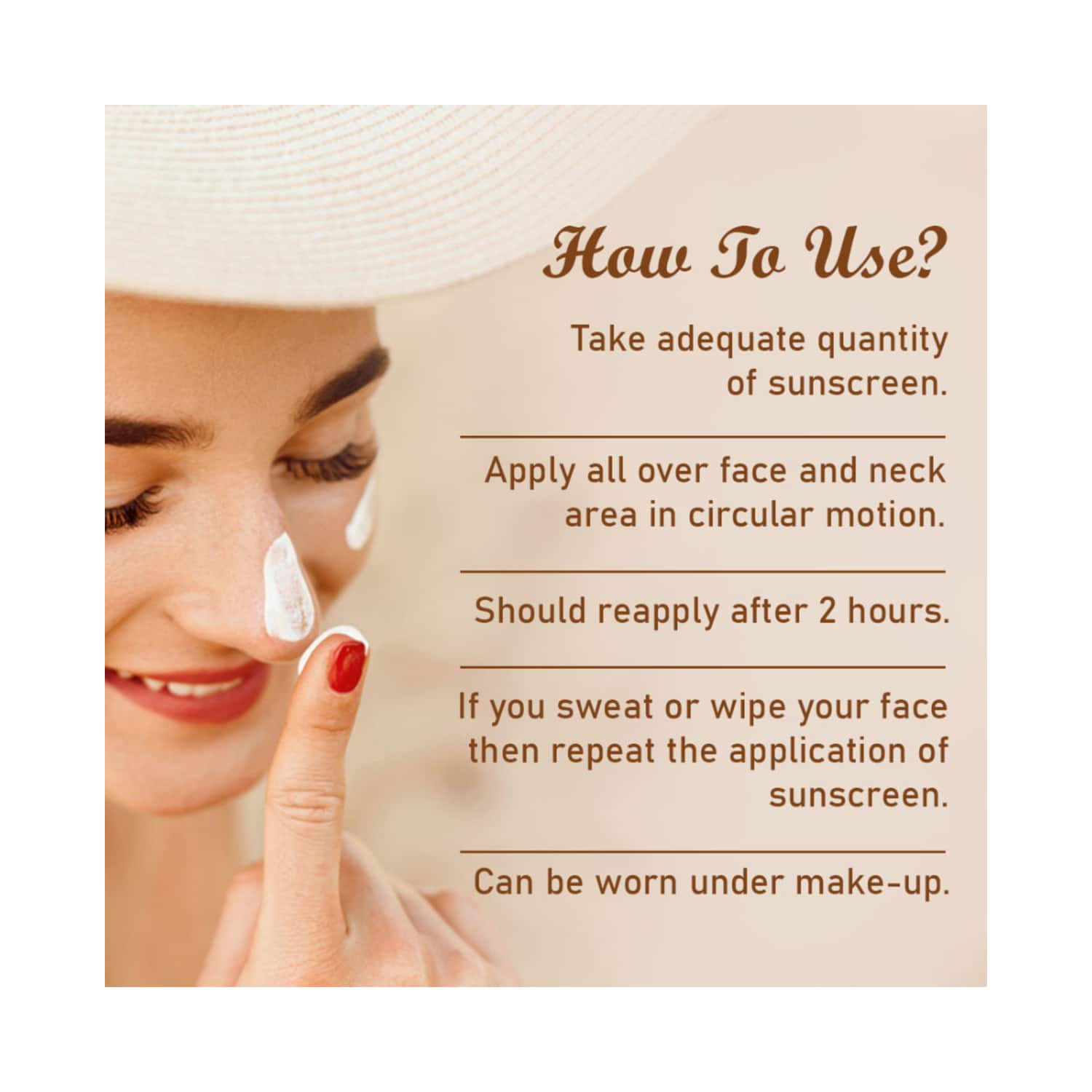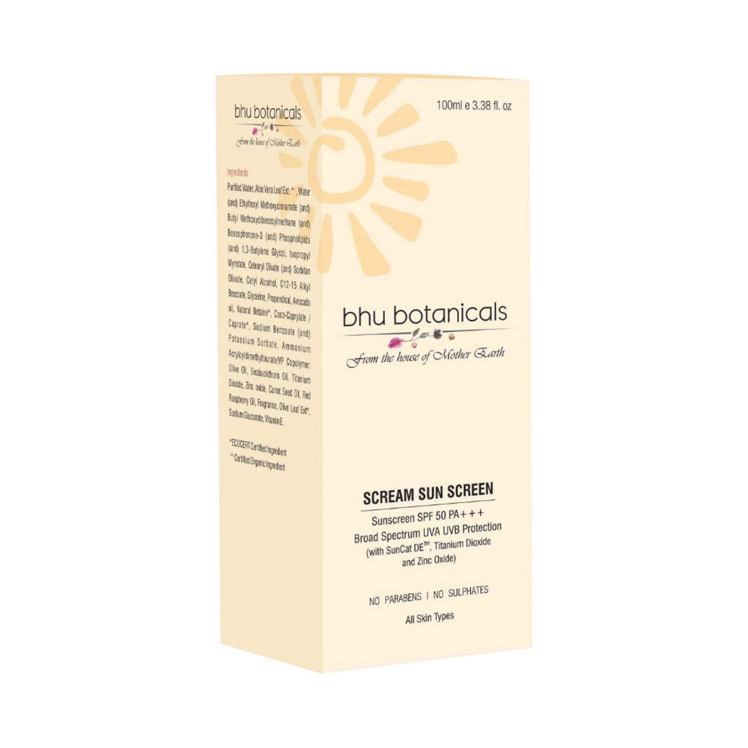 Shield your skin from the sun with the Bhu Botanicals Sunscreen Lotion SPF 50 PA+++ (100ml). This broad-spectrum sun protective emulsion contains sunblock actives and vitamin E, vitamin A, glycerin, and olive oil with an SPF of 50. For up to 6 hours, this sunscreen's integrated UV filter produces a shield on the skin, blocking UVA and UVB rays from penetrating. With a PA+++ rating, this high-performance sunscreen lotion is safe for all skin types, even with makeup.Key Features & Benefits:Broad-spectrum UVA and UVB sunscreen lotion with SPF 50Skin is not made oily or sticky by the light emulsion formulationLight Emulsion formula prevents skin from being overly greasy or stickyPA+++-rated high-performance lotionCruelty- and paraben-free sunscreen is safe to use on the skinKey Ingredients:Glycerin and Vitamin E: Hydrates skinOlive oil and vitamin A: Moisturizes skinHow to Use:Take a sufficient amount of sunscreen. Apply in a circular motion to the entire face and neck area. Repeat applying sunscreen if you wipe your face or perspire. Wearable under makeup.All Ingredients:Purified Water, Aloe Vera Leaf Ext., Water (And) Ethylhexyl Methoxycinnamate (And) Butyl Methoxydibenzoylmethane (And) Benzophenone-3 (And) Phospholipids (And) 1,3-Butylene Glycol, Isopropyl Myristate, Cetearyl Olivate (And) Sorbitan Olivate, Cetyl Alcohol, C12-15 Alkyl Benzoate, Glycerine, Propendioal, Avocado Oil, Natural Betaine, Coco-Caprylate / Caprate, Sodium Benzoate (And) Potassium Sorbate, Ammonium Acryloyldimethyltaurate/Vp Copolymer Olive Oil, Sea Buckthorn Oil, Titanium Dioxide, Zinc Oxide, Carrot Seed Oil, Red Raspberry Oil, Fragrance, Sodium Gluconate, Vitamin EAbout the Brand:Marvous Healthcare Pvt Ltd. has created the brand bhu botanicals to find answers for all of our skincare needs. They harness the power of natural substances and use them to create organic skincare products. The finest ingredients are chosen from the world to assure their effectiveness and fitness. The product line includes body, face, and eye care products along with combo routine kits for the skin. The brand is 95% natural, eco-friendly, and does not rely on animal testing.