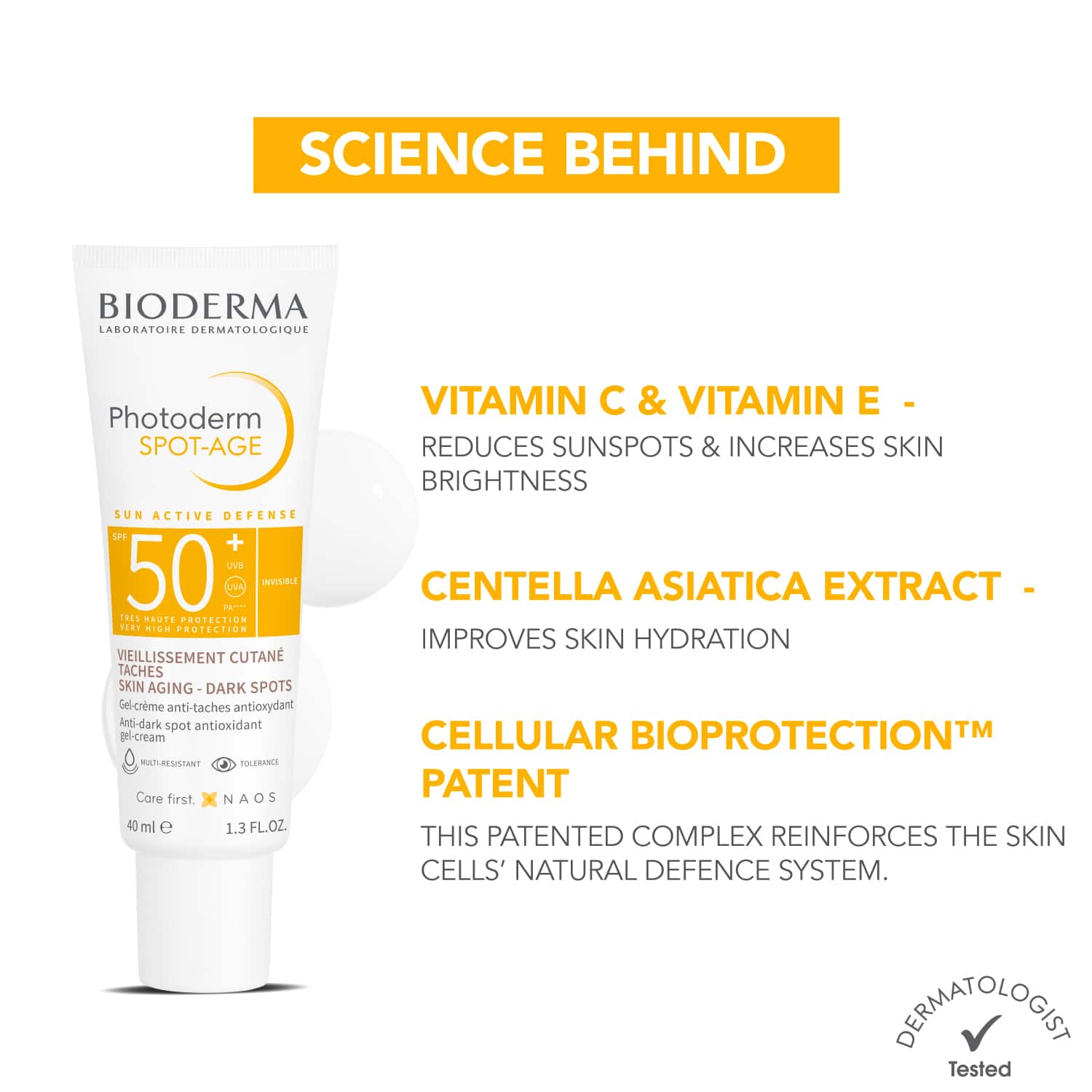 Keep your delicate skin protected from the harsh sun with the Bioderma Photoderm Spot Age Gel Sunscreen SPF 50+ (40ml). It is an anti-aging sunscreen with sun-active defense and SPF 50 that offers high UVA/UVB protection. Also, the essential vitamins C and E, Centella Asiatica, in this non-sticky sun protection cream have skin regenerative properties to reduce signs of aging. Plus, this Bioderma sunscreen is a light and dry touch gel-cream texture that provides long-lasting protection with an 8-hour SPF retention.