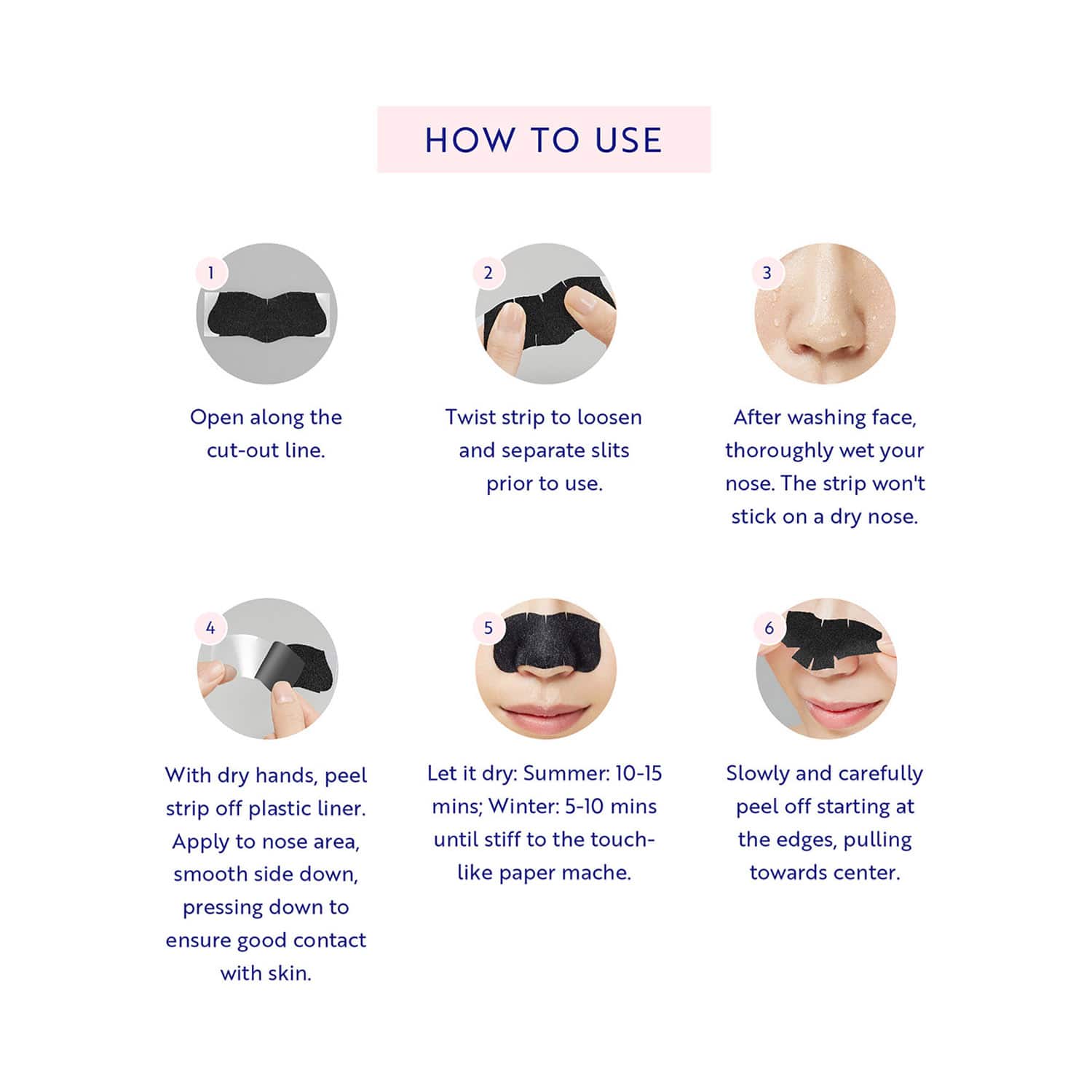 How to Use:Remove a strip from the package. With the plastic liner facing you, twist the strip to separate slits. Now dampen your nose with water. Firmly apply the smooth side of the strip onto your nose. Let the strip dry for about 10-15 minutes. Gently remove the strip.