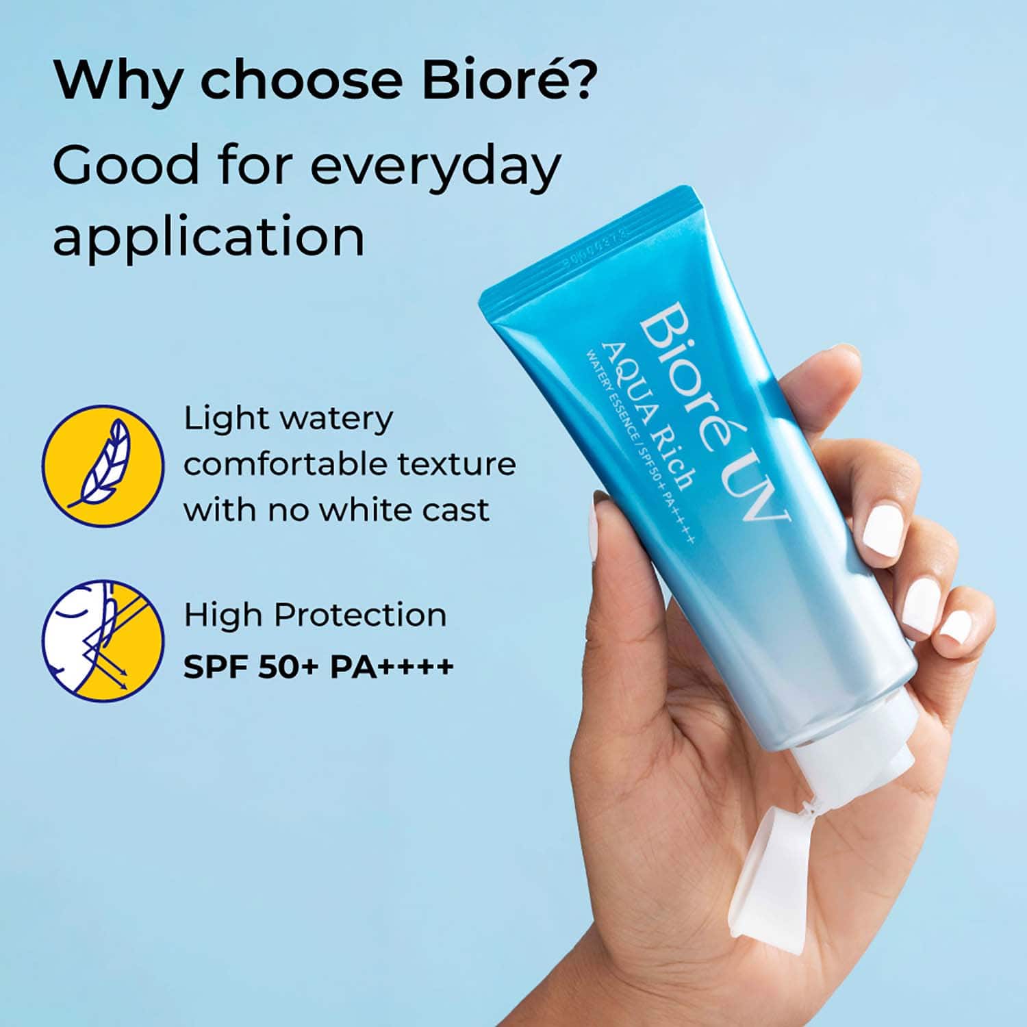 The Biore Uv Aqua Rich Watery Essence Sunscreen With SPF 50+ PA++++ (70g) is your ultimate shield against sun damage and dehydration. This lightweight sunscreen has a non-sticky texture that provides a natural skin finish. As an SPF 50 sunscreen, this waterproof sunscreen offers high protection from harmful UV rays and environmental stressors. Plus, this Biore sunscreen is non-comedogenic, allergy-tested, and leaves no white cast.