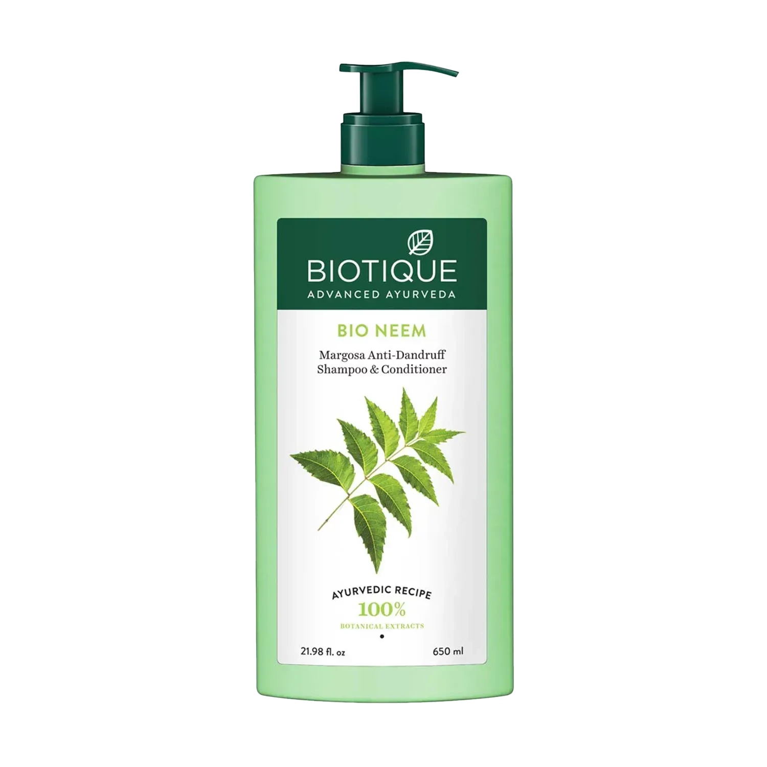 The Biotique Bio Neem Margosa Anti-Dandruff Shampoo & Conditioner - (650ml) provides an incredible sheen to your hair. It has a refreshing pH-balanced formula with skin-friendly ingredients for controlling dandruff, dryness, itching, and flaking in the hair. In addition, this Biotique hair shampoo and conditioner is gentle on the skin and gives a healthier shine to your hair.Key Features & Benefits:Enriched with the likes of margosa, reetha, and bhringraj to take complete care of the hairSpecial pH-balanced hair shampoo and conditioner works gently on the scalpHair shampoo and conditioner for controlling dandruff in the hairVegan, cruelty-free, and dermatologically tested hair shampoo and conditioner for safe useKey Ingredients:Margosa: Provides control on hair dandruffReetha: Prevents hair dryness with its cleansing propertiesBhringraj: Helps in keeping the hair shine intactHow to Use:Utilise the hair shampoo and conditioner generously for applying it to your wet hair. After that, create lather through your hair strands from the scalp to the ends before rinsing it thoroughly with normal water.All Ingredients:Gandhak (Sulphur), Neem (Azadirachta Indica), Chotidudhi (Euphorbia Thymi Folia), Bhringraj (Eclipta Erecta), Ritha (Sapindus Mukorossi), Lotion Base Q.S.About the Brand:Founded in 1992 by Vinita Jain, Biotique blends modern Swiss biotechnology and the 5000-year-old wisdom of Ayurveda to create the ultimate organic skincare and makeup products for Indians. The brand has a team of qualified ayurvedic doctors, scientists, and Swiss cosmetologists to produce cruelty-free products that treat and preserve health, beauty, and well-being. Each and every product of Biotique is 100% pure, organic, and dermatologically tested to ensure responsible, effective beauty treatment for every customer.Check out more Biotique Shampoo options here, or browse through tokocart's full range of Shampoo from top global brands.You can also explore other products from the world of Biotique here on tokocart.