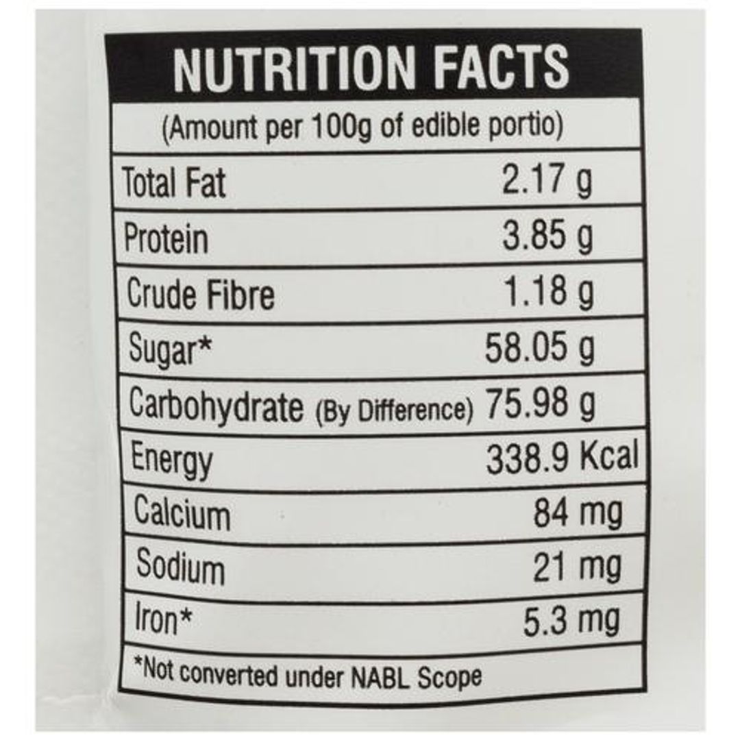 Per 100 :- Total Fat: 2.17g, Protein:3.85g, Crude Fibre:1.18g, Sugar: 58.05g, Carbohydrate: 75.98g, Energy: 338.9Kcal, Calcium: 84mg, Sodium: 21mg, Iron:5.3mg.