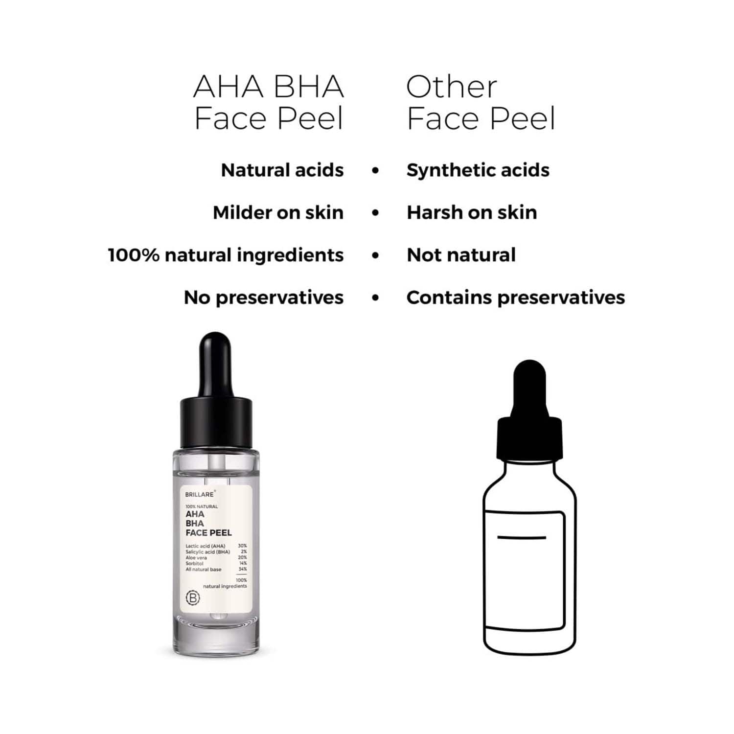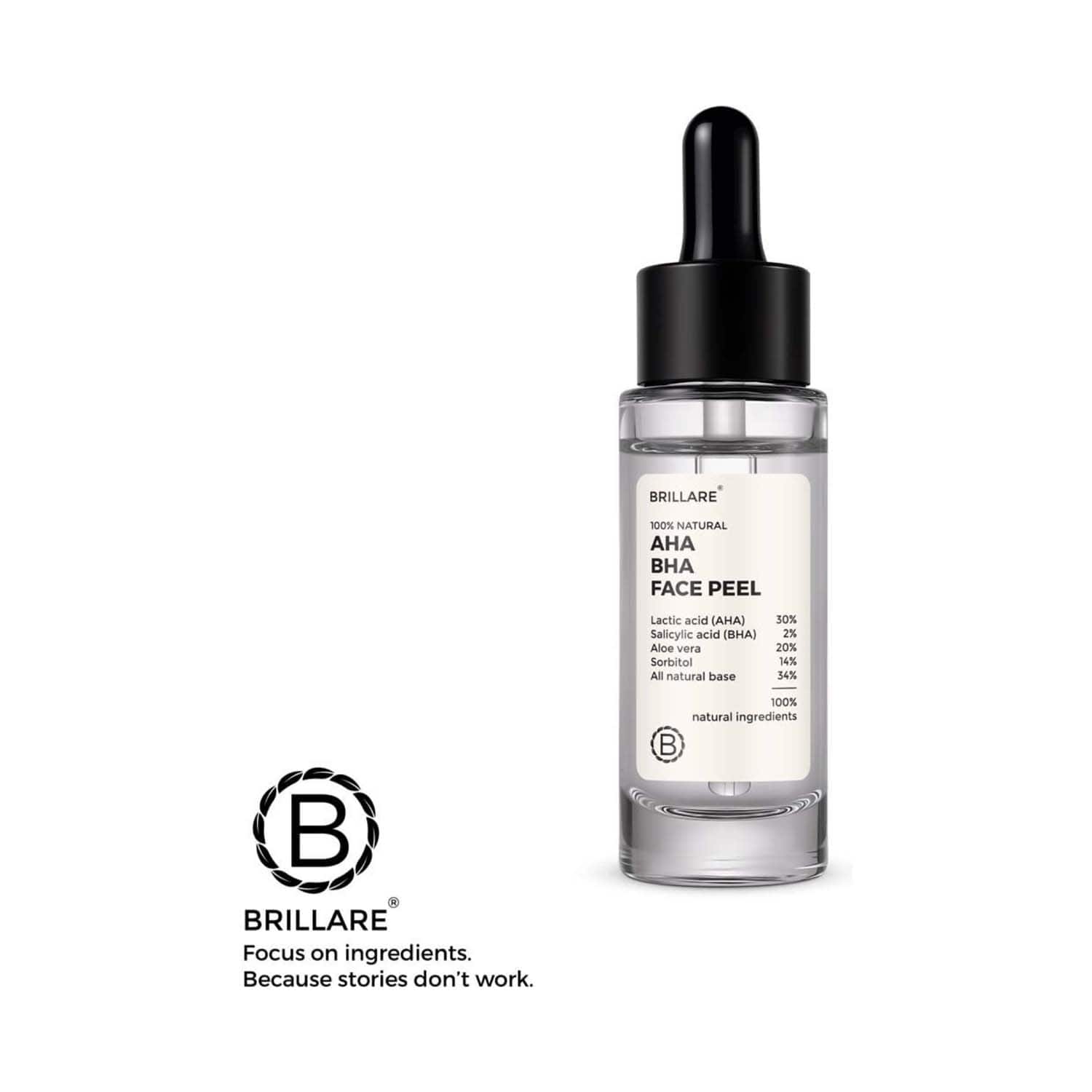Bid farewell to skin dullness with the Brillare AHA BHA Face Peel For Smoother Blemish-Free Skin (30ml). This exfoliating face-peeling solution is infused with AHA and BHA to naturally exfoliate dead skin cells and leave the face glowing and smoother. Also, this Brillare face peel reduces the signs of aging to make you look more youthful. Key Features & Benefits:Formulated with lactic acid and salicylic acid to exfoliate the skinRemoves dead skin cells to make the skin glowing and smootherEffectively unclogs pores for a fresh complexion100% natural formula is safe to use on all skin types Key Ingredients:Lactic acid: Exfoliates the skin, lightens dark spots, and improves the look of wrinklesSalicylic acid: Mildly exfoliates the skin, removes excess oil, and reduces whiteheads and blackheads formation All Ingredients:Fermented Sugar Derived Aha 30% (Lactic Acid), Sugarcane Derived Moisturiser 20% (Butylene Glycol), Aloe Vera Juice 20% (Aloe Barbadensis Leaf Juice), Potato Starch Derived Moisturiser (Sorbitol) 14.1%, Fermented Sugar Derived Moisturiser 12% (Sodium Lactate), Salicylic Acid From Wintergreen Leaf 2% (Gaultheria Procumbens), Marine Salt Derived Ph Balancer 1% (Sodium Hydroxide), Rose & Coconut Derived Antimicrobial 0.7% (Caprylhydroxamic Acid & Phenethyl Alcohol), Fermented Corn Derived Water Softener 0.2% (Sodium Gluconate). How to Use:Clean your face. Then, take 3-4 drops of the face-peeling solution on your palm with the dropper. Layer it on your face without massaging. Avoid dripping it on the eyes and lips. Leave it for not more than 15 minutes and rinse it off with cold water. Repeat every week. About the Brand:Initiated in 2009, Brillare is an Indian personal care brand founded by Jigar Patel and his team of five core members. It offers a wide range of products like shampoo, creams, etc., targeted at specific skin care and hair care woes. The brand aims to provide unmatched care to its customers and help them efficiently resolve their skin and hair issues. Thus, all products of Brillare are 100% natural and do not use any chemicals or preservatives that can harm your hair or skin in the long run.