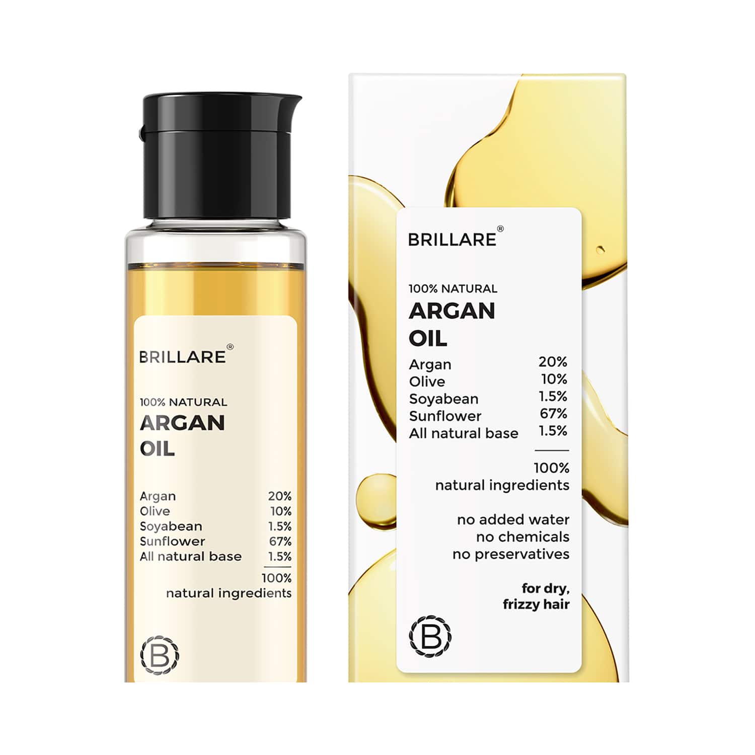 Elevate the health of your hair with the Brillare Argan Oil For Dry, Frizzy Hair (100ml). This nourishing hair oil contains a blend of natural oils that together help to restore your hair health. It is enriched with argan, olive, and soybean oils to prevent dryness and frizz. In addition, this Brillare hair oil helps stop moisture loss, making your hair smooth and manageable all day.Key Features & Benefits:Infused with argan, olive, and soybean oils to hydrate your hairHelps to keep away dryness and frizzinessMakes hair soft, smooth, and manageablePrevents moisture loss from hairKey Ingredients:Argan, olive, and soybean oils: Nourish and moisturize hairAll Ingredients:Sunflower Oil (Helianthus Annuus Seed Oil) 67.275%, Argan Oil (Argania Spinosa Kernel Oil) 20%, Olive Oil (Olea Europaea) 10%, Soyabean Oil (Glycine Soja Oil)1.5%, Plant Based Vitamin E (Alpha Tocopherol) 0.5%, Wheat Germ Oil (Triticum Vulgare Germ Oil) 0.47%, Plant Based Essential Oil Blend (Perfume) 0.25%How to Use:Open the cap of the hair oil vial. Then, apply a dropper to its mouth. Next, apply hair oil on the roots of your strands using the dropper. Massage your scalp gently using your fingertips to spread the oil. Leave on overnight or wash off with a mild shampoo at least 30 minutes after.About the Brand:Initiated in 2009, Brillare is an Indian personal care brand founded by Jigar Patel and his team of five core members. It offers a wide range of products like shampoo, creams, etc., targeted at specific skin care and hair care woes. The brand aims to provide unmatched care to its customers and help them efficiently resolve their skin and hair issues. Thus, all products of Brillare are 100% natural and do not use any chemicals or preservatives that can harm your hair or skin in the long run.