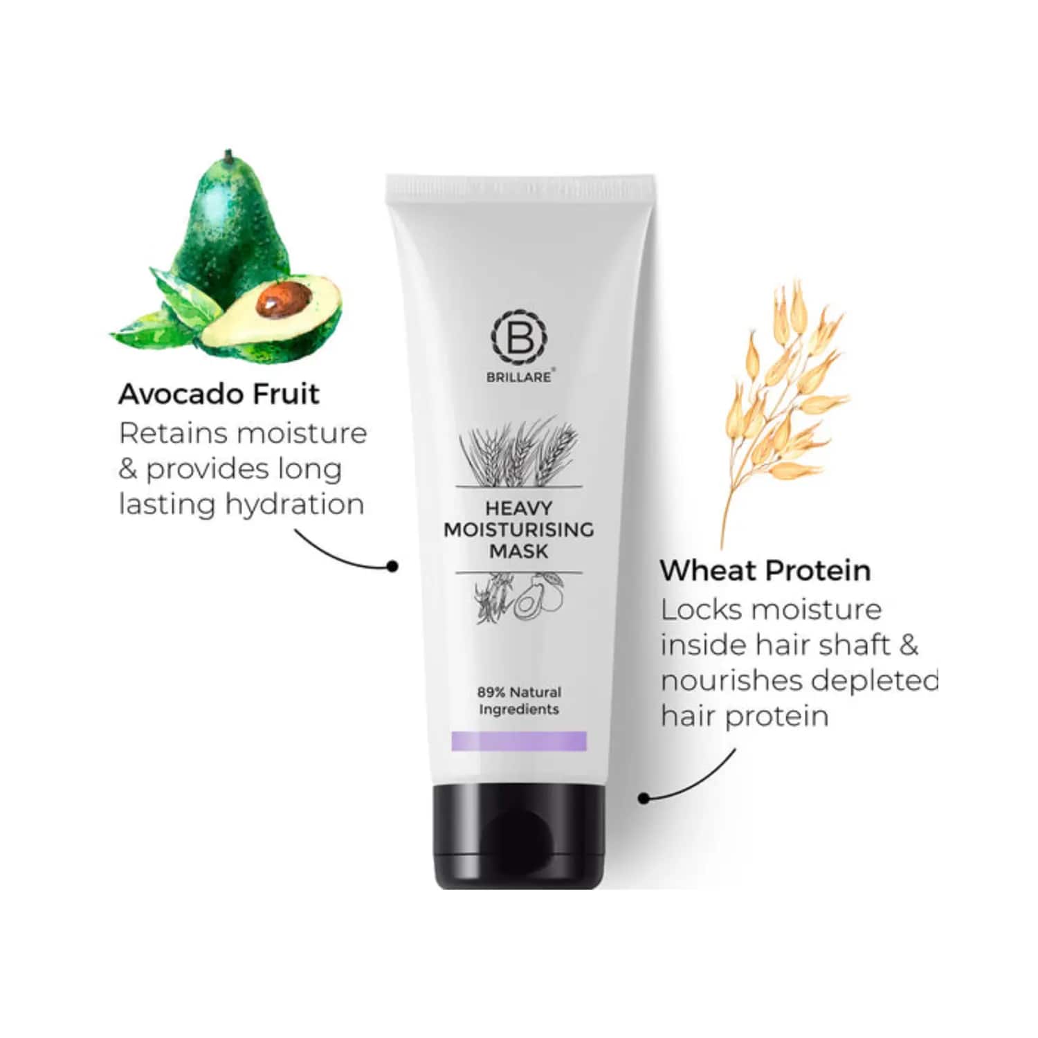 Give your hair the pampering it needs with the Brillare Heavy Moisturising Mask For Dry, Frizzy Hair (125 g). This intensive conditioning mask has richly hydrating ingredients, including wheat proteins, avocado, and sugarcane, to condition your hair. It helps infuse intense moisture in your thirsty hair to its retain natural sheen and softness. The hair cream also adds thickness, allowing you to enjoy detangled, frizz-free hair every day.Key Features & Benefits:Provides deep hydration to the shaftOffers shinier, fuller hair by preventing moisture lossHelps in achieving frizz-free hairProvides natural nutrition and has no side-effectChemical-free, 100% vegan moisturising conditionerKey Ingredients:Avocado: Helps with long-lasting hydration by locking moistureWheat: Helps lock moisture and improves protein count on the hair shaftSugarcane: It nourishes the scalp, prevents dryness, and promotes hair growthAll Ingredients:Aqua, Cetyl Alcohol, Cannola Oil, Cyclopentasiloxane, Behentrimonium Chloride, Palmitamidopropyltrimonium Chloride, Bishydroxy/ Methoxy Amodimethicone, Cyclotetrasiloxane, Sodium Pca.How to Use:Apply on wet hair right after shampoo. Massage gently from root to tips. Keep it for 3-5 minutes, then rinse it well.About the Brand:Brillare was founded in the year 2009. Since then, it has been offering a wide range of personal care products that cater to the need of thousands of customers. The brand's motto has always been to formulate natural and vegan products for safe usage. Their chemical-free skin and hair care products are formulated to suit all skin types for solving the hair and skin problems of every consumer.Check out more Brillare Conditioner options here, or browse through tokocart's full range of Conditioner from top global brands.You can also explore other products from the world of Brillare here on tokocart.