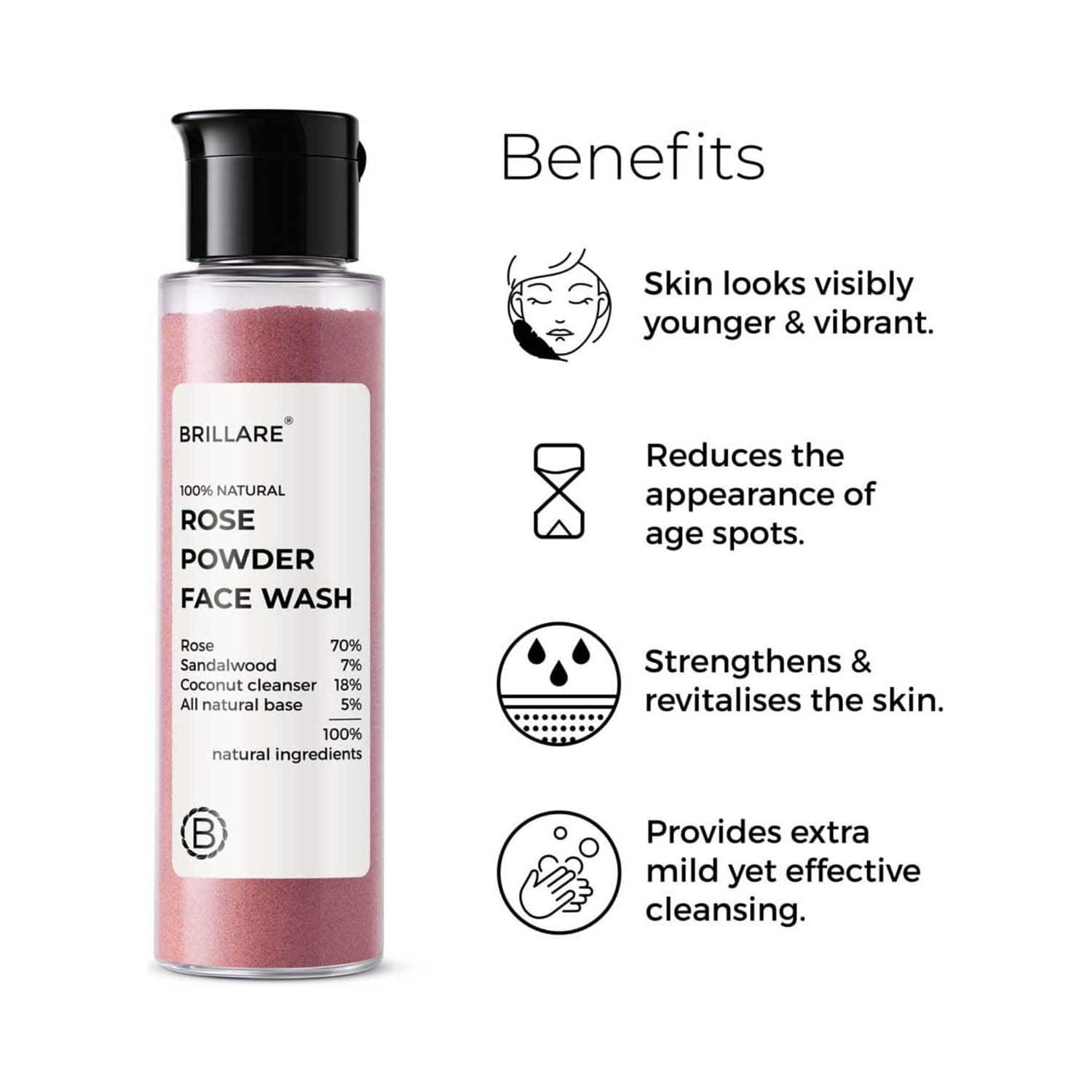 Restore the glow and youthfulness of your skin with the Brillare Rose Powder Face Wash For Well Hydrated Younger Looking Skin (30g). This hydrating powder facewash is made from raw rose petal powder to rejuvenate the skin and leave it younger-looking. Also, the sandalwood in this Brillare powder facewash reduces the appearance of age spots and strengthens the skin for a youthful, brighter, and even-toned complexion. Key Features & Benefits:Made from raw rose petal powder to rejuvenate the skinContains sandalwood to reduce the appearance of age spotsStrengthens the skin and lightens age spots for a youthful complexion100% natural formula provides extra mild yet effective cleansing Key Ingredients:Rose: Rejuvenates the skin and adds a glowSandalwood: Helps to heal irritated skin and treat acne scars All Ingredients:Rosa Indica (Indian Rose) Petal Powder (70%), Sodium Cocoyl Glutamate (Coconut Derived), Santalum Album (Sandalwood) Bark Powder, Argania Spinosa (Argan) Kernel Oil, Rosa Indica (Rose) Flower Oil, Natural Silica, Caprylhydroxamic Acid (Coconut & Palm Derived), Glyceryl Caprylate (Coconut & Palm Derived), Glycerin (Coconut & Palm Derived) How to Use:Take coin-size facewash powder on your wet palm. Then, add a few drops of water and rub it between your palms to create a mild foam. Massage it gently over your face. Add more water if required. Rinse it off well with water. About the Brand:Initiated in 2009, Brillare is an Indian personal care brand founded by Jigar Patel and his team of five core members. It offers a wide range of products like shampoo, creams, etc., targeted at specific skin care and hair care woes. The brand aims to provide unmatched care to its customers and help them efficiently resolve their skin and hair issues. Thus, all products of Brillare are 100% natural and do not use any chemicals or preservatives that can harm your hair or skin in the long run.