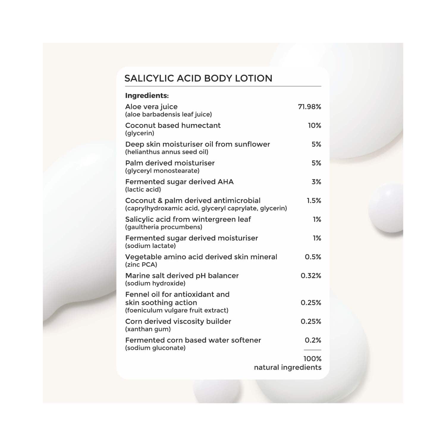 Your journey to acne-free, confident skin starts with the Brillare Salicylic Acid Body Lotion For Clear Purified Acne Prone Skin (200ml). This natural, liquid moisturizer is infused with salicylic acid and zinc to combat active acne by clearing excess oil and unclogging the pores for clear and glowing skin. Also, this Brillare body lotion is a quick-absorbing, lightweight moisturizer that provides intense hydration without leaving the skin greasy or sticky.Key Features & Benefits:Prepared with salicylic acid and zinc to fight active acneLightweight formula absorbs quicklyDeeply moisturizes the skin without making it oily or greasyUnclogs the pores and removes dead skin cells and excessive oilKey Ingredients:Salicylic acid: Mildly exfoliates the skin, removes excess oil, and reduces whiteheads and blackheads formationZinc PCA: Attacks acne-causing bacteria and reduces excess oil productionAll Ingredients:Aloe Vera Juice 71.98% (Aloe Barbadensis Leaf Juice), Coconut Based Humectant 10% (Glycerin) Deep Skin Moisturiser Oil From Sunflower 5% (Helianthus Annuus Seed Oil), Palm Derived Moisturiser 5% (Glyceryl Monostearate), Fermented Sugar Derived Aha 3% (Lactic Acid), Coconut & Palm Derived Antimicrobial (Caprylhydroxamic Acid, Glyceryl Caprylate, Glycerin), 1.5% Salicylic Acid From Wintergreen Leaf (Gaultheria Procumbens), 1% Fermented Sugar Derived Moisturiser 1% (Sodium Lactate) Vegetable Amino Acid Derived Skin Mineral 0.5% (Zinc Pca) Marine Salt Derived Ph Balancer 0.32% (Sodium Hydroxide), Fennel Oil For Antioxidant And Skin Soothing Action (Foeniculum Vulgare Fruit Extract) 0.25% Corn Derived Viscosity Builder 0.25% (Xanthan Gum) Fermented Corn Based Water Softener 0.2% (Sodium Gluconate) "How to Use:Wash your skin. Take a bit of the lotion and put it on your skin. After that, massage well for increased hydration. Apply twice daily for the best results.About the Brand:Initiated in 2009, Brillare is an Indian personal care brand founded by Jigar Patel and his team of five core members. It offers a wide range of products like shampoo, creams, etc., targeted at specific skin care and hair care woes. The brand aims to provide unmatched care to its customers and help them efficiently resolve their skin and hair issues. Thus, all products of Brillare are 100% natural and do not use any chemicals or preservatives that can harm your hair or skin in the long run.Check out more Brillare Body Lotions & Moisturisers options here, or browse through tokocart's full range of Body Lotions & Moisturisers from top global brands.You can also explore other products from the world of Brillare here on tokocart.