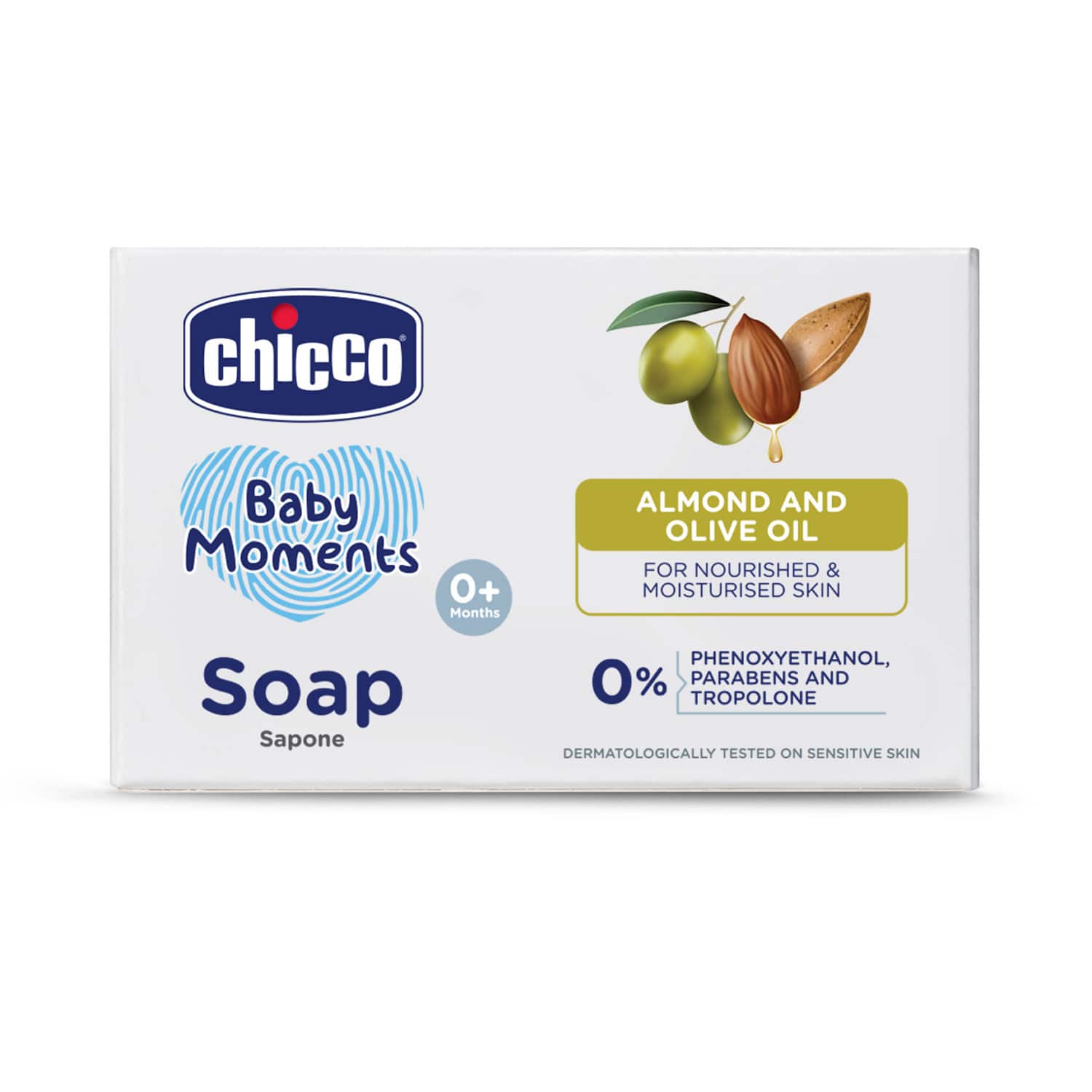Love, laughter, and lather! Treat your little one to the best with the Chicco Baby Moments Soap (125 g). Enriched with the goodness of olive and almond oil, it prevents dryness and retains moisture, leaving the baby's skin soft and supple. This soap features an advanced, phenoxyethanol-free composition that significantly reduces the risk of skin irritation and allergies, perfect for sensitive skin. The no-tears formula cares for your child's delicate eyes, making bath time a soothing experience. Plus, it offers a pleasantly scented cleanse that both you and your baby will love.Key Features & Benefits:Gentle soap cleanses the skin without causing irritation or allergic reactionsInfused with the goodness of almond oil to nourish and moisturize the delicate baby skinEnriched with olive oil to lock in moisture, preventing dryness and maintaining the skin's hydration levelsFormulated with no-tears formula, promising soothing and tear-free bathing experienceDermatologically tested and phenoxyethanol-free, suitable for even the most sensitive skinMade of vegetarian origin ingredients and free from parabens, tropolone, mineral oil, SLS, SLES, alcohol, dyes with no added EDTA and phthalateKey Ingredients:Almond oil: Soothes irritation and nourishes baby's delicate skinOlive oil: Prevents dryness and keeps the skin soft and suppleAll Ingredients:Almond Oil & Olive OilHow to Use:Wet your baby's skin with warm water, rub the soap gently in your palm to create the foamy lather and massage it onto your baby's skin. Then rinse thoroughly with lukewarm water to leave their skin clean and fresh. For external use only.About the Brand:Established in 1958 in Como, Italy, Chicco is an esteemed Italian brand celebrated as one of the world's leading and most reliable baby care brands. With a presence in over 120 countries, Chicco boasts over 60 years of expertise in providing an extensive array of baby products. From nursing essentials and baby toiletries to toys, travel gear like strollers and car safety seats, and fashionable clothing options, Chicco offers a comprehensive range to meet the needs of parents worldwide.