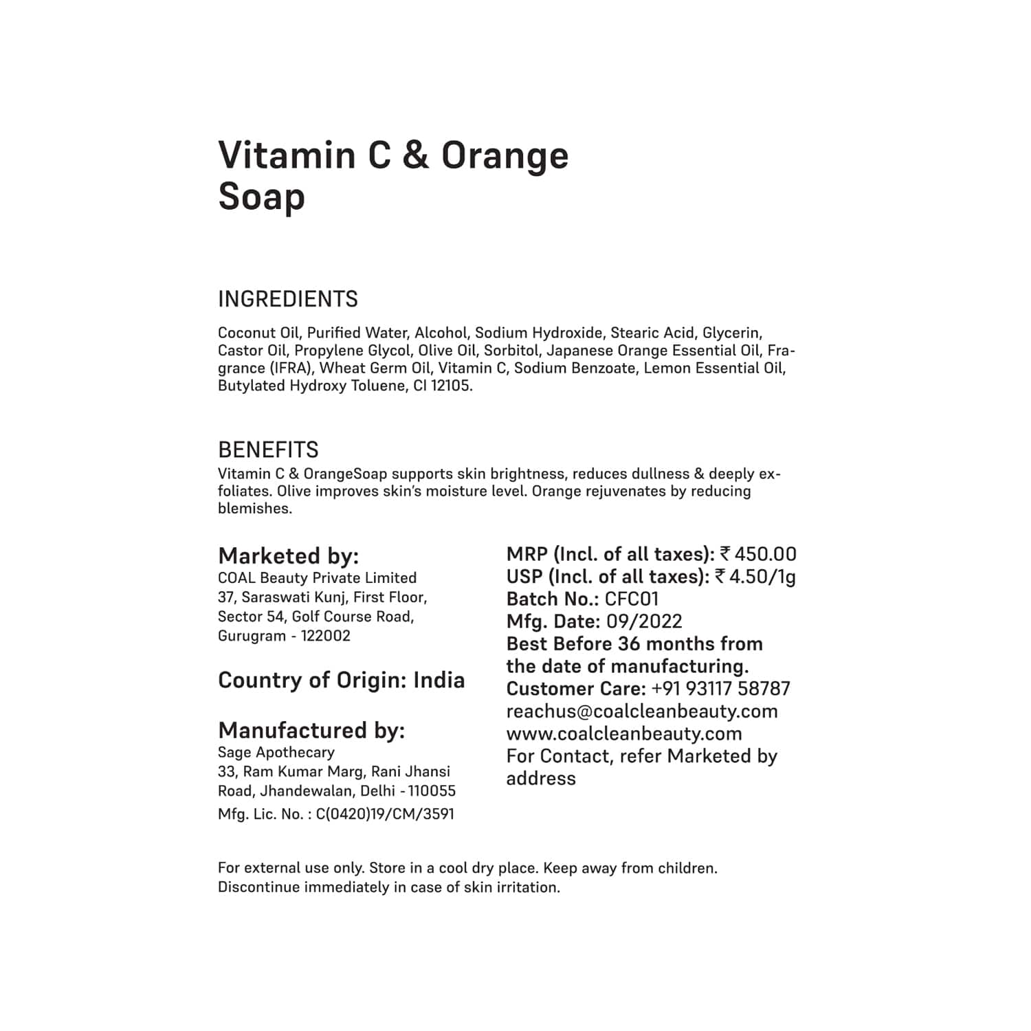 The Coal Clean Beauty Vitamin C & Orange Soap (100g) keeps the skin nourished and soft. This cleansing soap removes impurities and is packed with vitamin C to keep the skin plump and glowing. Also, the Coal Clean soap contains orange and coconut oils to moisturize and reduce blemishes.Key Features & Benefits:Infused with vitamin C to promote glowing skinEnriched with orange to reduce blemishesContains coconut oil to moisturize the skinFormulated to suit all skin typesFree from toxins, parabens, and harmful chemicals to ensure safe useKey Ingredients:Vitamin C and orange oil: Brighten the skinOlive oil and glycerin: Moisturize the skinLemon: Soothes the skinAll Ingredients:Coconut Oil, Purified Water, Alcohol, Sodium Hydroxide, Stearic Acid, Glycerin, Castor Oil, Propylene Glycol, Olive Oil, Sorbitol, Japanese Orange Essential Oil, Fragrance (Ifra), Wheat Germ Oil, Vitamin C, Sodium Benzoate, Lemon Essential Oil, Butylated Hydroxytoluene, Ci 12105.How to Use:Take the soap. Apply it to your damp skin. Massage gently and work up a lather. Rinse off with water.About the Brand:Rrajesh Bakshi, a serial entrepreneur and experienced company builder, founded Coal to give every Indian the opportunity to participate in India's growth story. They aim to fundamentally enhance the trust of their consumers in skin care products. They deeply researched the skin care products offered to be high performance, hypoallergenic, and of premium quality. These natural products are packaged in various luxurious and innovative face and body care products and are carefully formulated to promote healthy and radiant skin.Check out more COAL CLEAN BEAUTY Soaps options here, or browse through tokocart's full range of Soaps from top global brands.You can also explore other products from the world of COAL CLEAN BEAUTY here on tokocart.