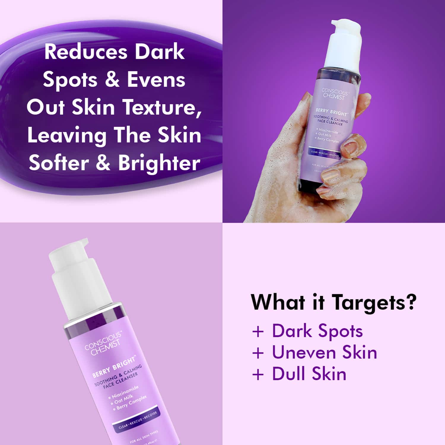 When selecting a face wash for normal to oily skin, it’s essential to look for a formula that will deeply cleanse, without disrupting your skin’s natural moisture barrier. Conscious Chemist Pore Berry Bright Face Cleanser is formulated with niacinamide and berry complex which helps to maintain your skin’s protective barrier, lock in moisture, and calm your skin. Developed with dermatologists, this nondrying face wash for normal to oily skin deeply cleanses, removes excess oil, and refreshes your skin without disrupting the skin barrier. This face wash is an effective, yet gentle way to cleanse and care for your normal to oily skinKey Features & BenefitsVisible minimizes pores and prevents sebum buildupRich in antioxidants and fights free radicals damageCalms and soothes irritated skin Key Ingredients NiacinamideBerry ComplexCICA ExtractAll Ingredients:Demineralised Water, Coco Glucoside, Decyl Glucoside, CAPB, Glycerine, Aloe Barbadensis Leaf extract, Propylene Glycol, Xanthan Gum, Niacinamide, Vaccinium Myrtillus Extract (Blueberry Extract), Euterpe Oleracea Extract (Acaiberry Extract), Avena Sativa (Oat) Kernel Extract, Polysorbate 20, EDTA, Citric Acid, Phenoxyethanol