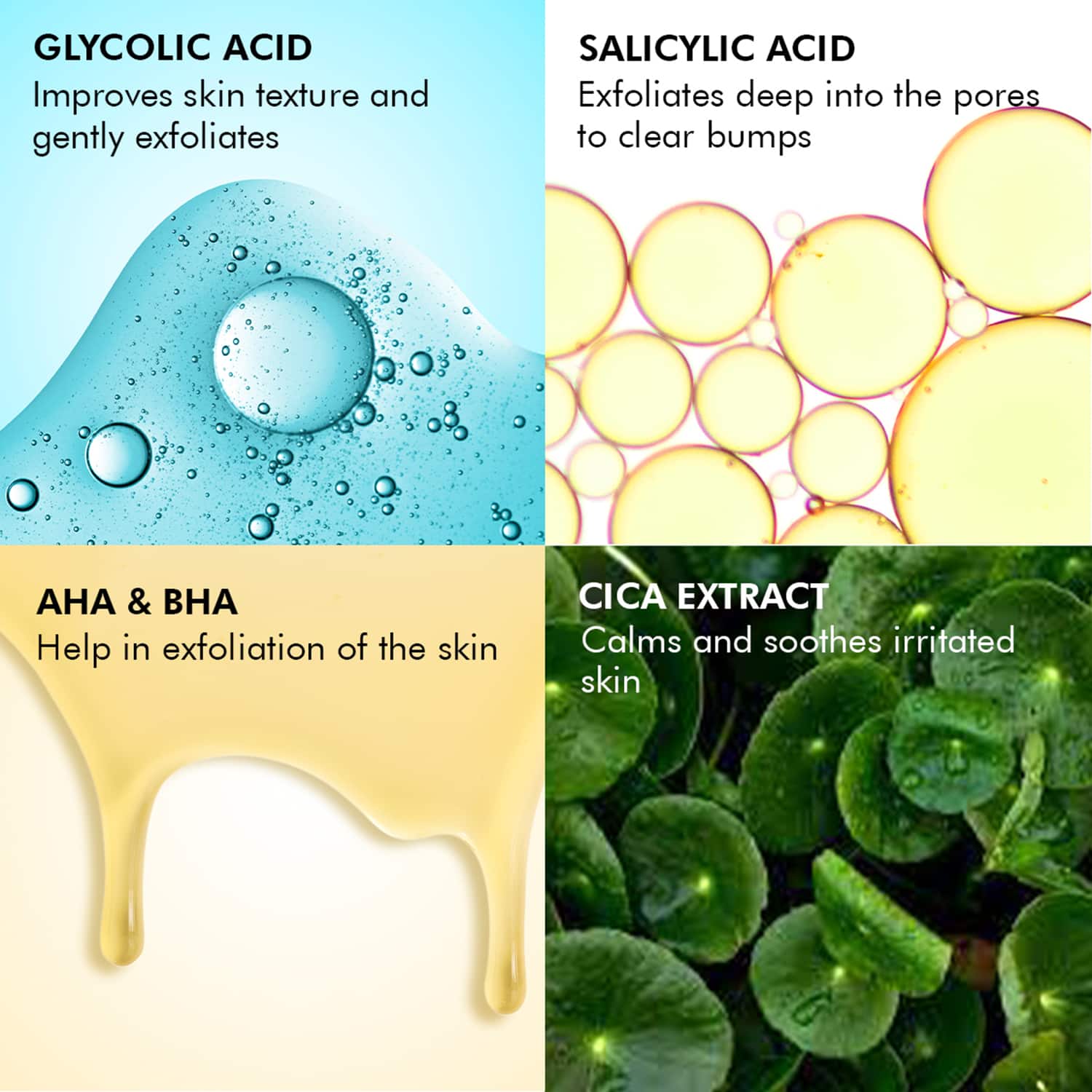 Key Features & BenefitsImproves skin texture gently exfoliatesRemoves dead skin cells and clears congested poresCalms and soothes irritated skinKey IngredientsGlycolic AcidSalicylic AcidCICA ExtractAll Ingredients:Demineralised Water, Coco Glucoside, Decyl Glucoside, CAPB, Glycerine, Salicyclic Acid, Glycolic Acid, Ellagic Acid, Xanthan Gum, Punica Granatum Seed Oil (Pomegranate Oil), Propylene Glycol, Glycyrrhiza Glabra Linné Extract (licorice extract), Centella Asiatica Extract, Polysorbate 20, TEA, Citrullus Lanatus (watermelon) Extract, EDTA, Phenoxyethanol