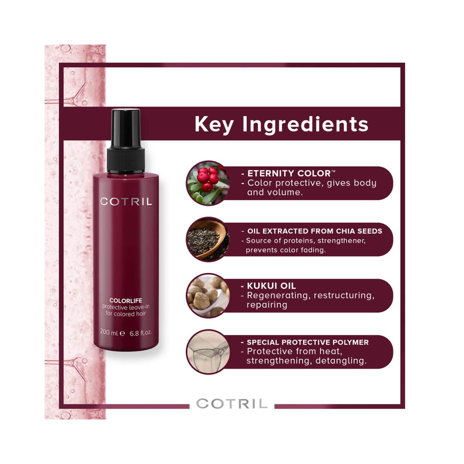 Add life to your colored hair with the COTRIL Colorlife Protective Leave In For Colored Hair (200 ml). Enriched with Eternity Color™, chia seed oil extract, and kukui oil, this softening leave-in conditioner for colored hair nourishes your hair and leaves it feeling soft. This revolutionary protective leave-in conditioner seals color pigments while safeguarding your hair against heat damage.