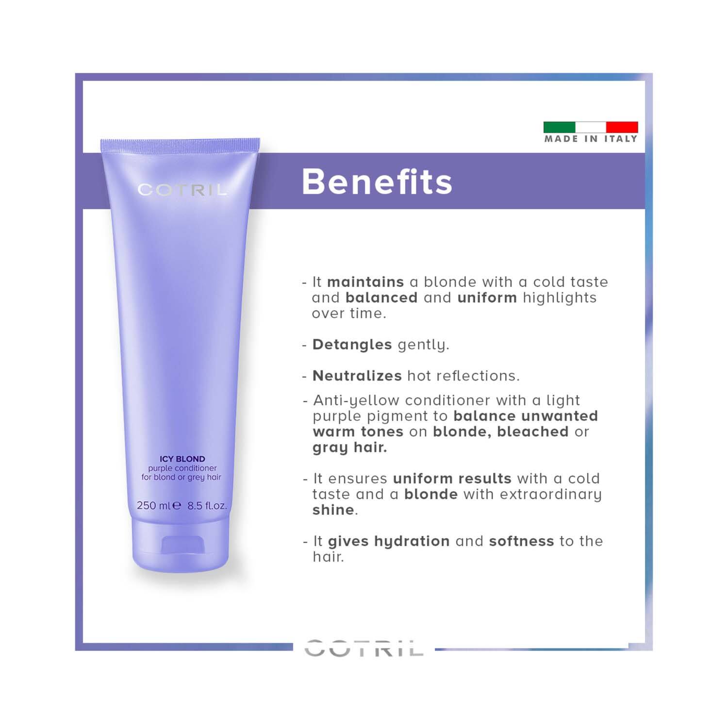 Give a new life to your blond hair with the COTRIL Icy Blond Purple Conditioner (250 ml). Infused with caviar extract, tsubaki oil, eco bio black blueberry extract, and panthenol, this anti-yellow conditioner balances unwanted warm tones in blonde, bleached, or gray hair. This illuminating conditioner for blond hair ensures more uniform blonde locks while keeping them hydrated and soft.