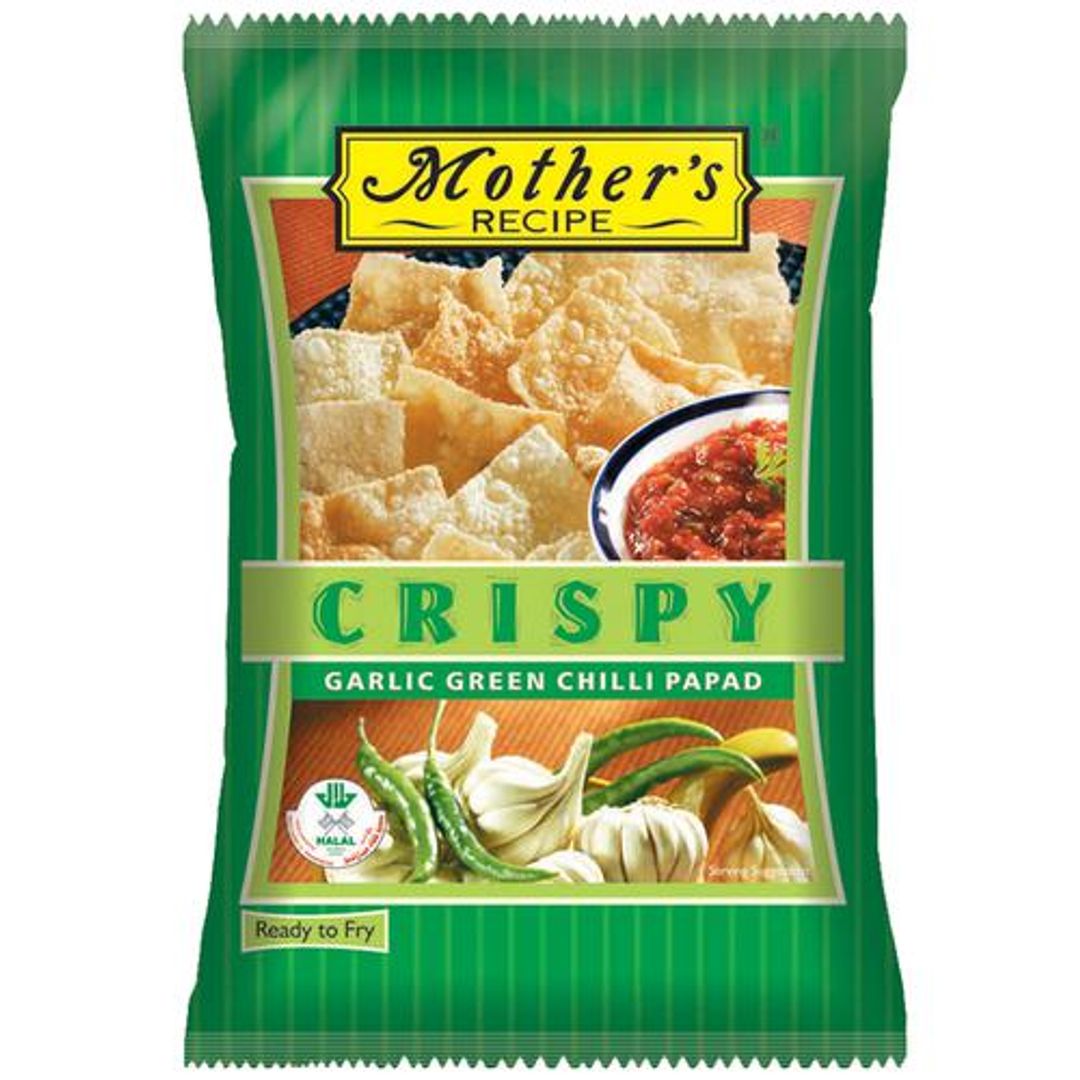 Mother's Recipe Garlic Green Chilli Crispy Papad is a snack composed of rice flour and urad dal flour. It puffs when deep-fried and tastes delicious. It is crisp and delicious. This papad has the goodness of rice flavoured with a blend of spices and salt. This is a garlic and green chilli flavoured papad with a blend of other spices. It is usually served with a meal or can be taken as a snack. Papad is a good appetiser and digestive. It tastes delicious because of its crispiness.