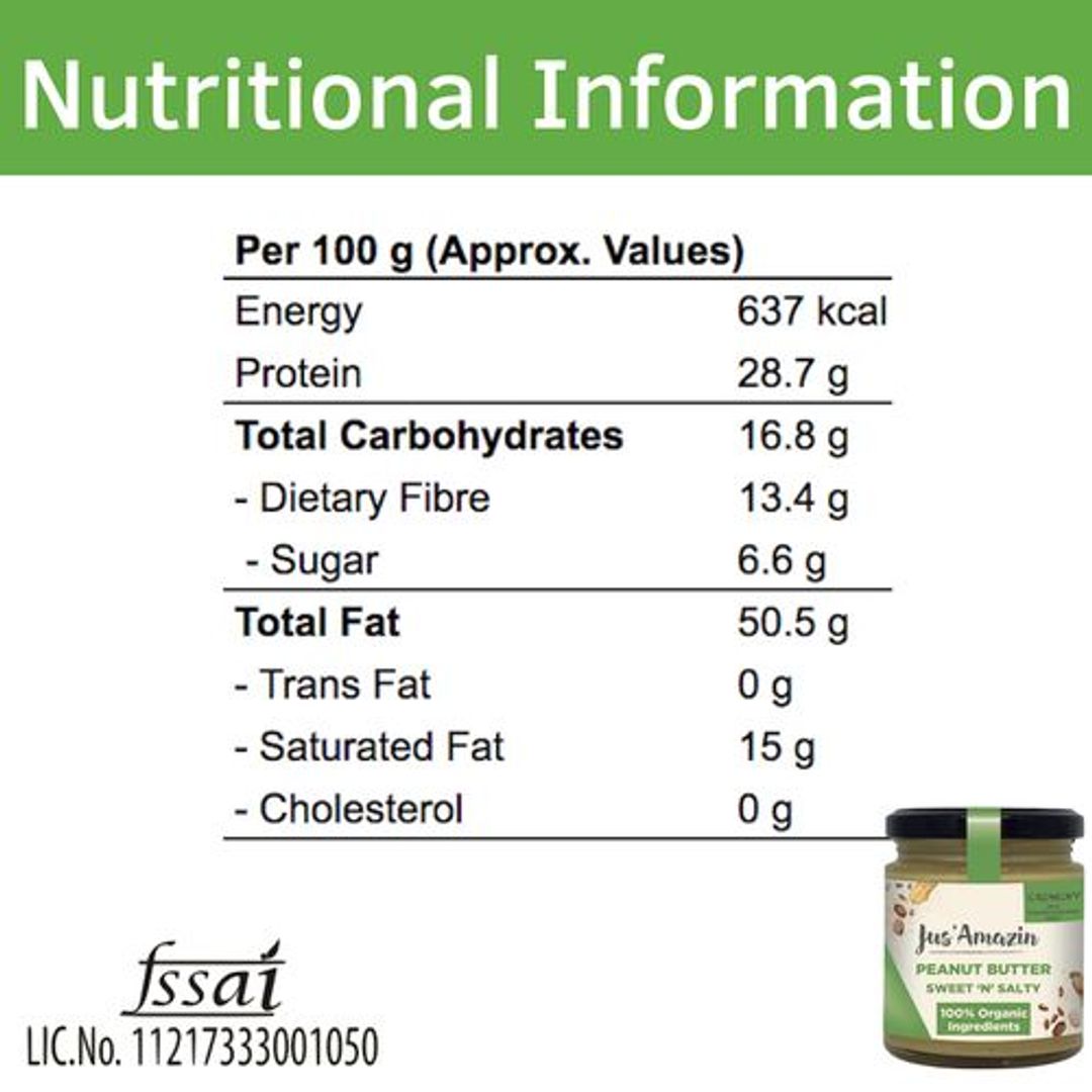 This Organic Peanut Butter with Crunchy Flax and Sunflower Seeds is made with certified organic ingredients and zero hydrogenated fats this unique crunchy peanut butter marries the crunch of organic flax and organic sunflower seeds with the wonderful flavour of salted peanuts with organic jaggery to provide the absolute fine balance between sweet and salt that makes this butter a hit with people across age-bands. Also, it is packed with micronutrients such as vitamin B1, vitamin E, calcium, iron, magnesium, folic acid, and copper, which has good and healthy fat. This is a healthier alternative to others in the marketplace. With 29 % protein, it is suitable for people on a high protein diet. It contains crunchy flax and sunflower seeds. It has a high protein content and is vegan.