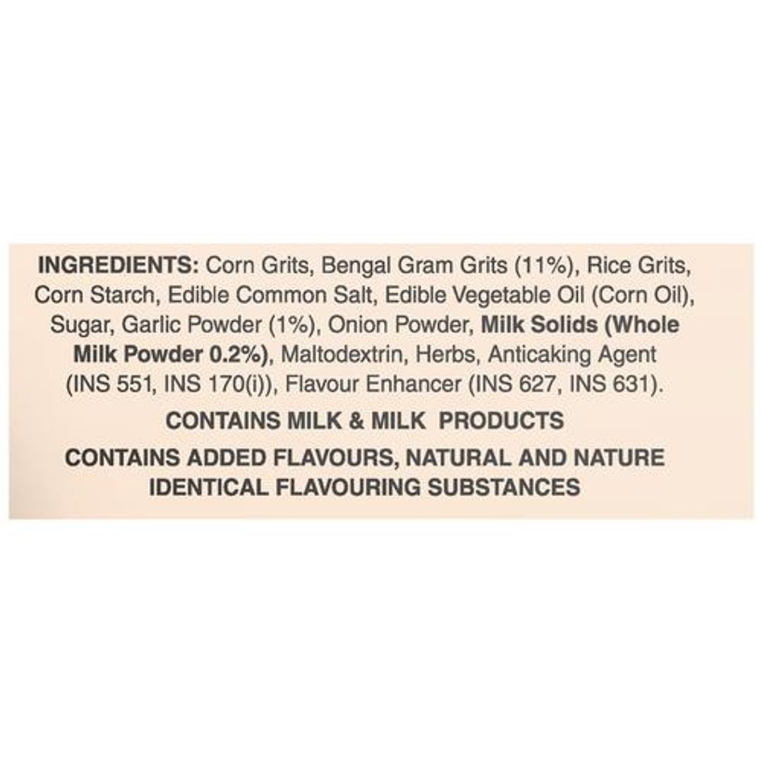 Corn Grits, Bengal Gram Grits, Rice Grits, Corn Starch, Edible Common Salt, Edible Vegetable Oil (Corn Oil), Chickpea Grits (1.5%), Sugar, Garlic Powder (1%), Onion Powder, Milk Solids (Whole Milk Powder (0.2%)), Maltodextrin, Herbs, Anticaking Agent (Ins 551, Ins 170(I)), Flavour Enhancer (Ins 627, Ins 631). Contain Milk & Milk Products Contains Added Flavours, Natural And Nature Identical Flavouring Substances