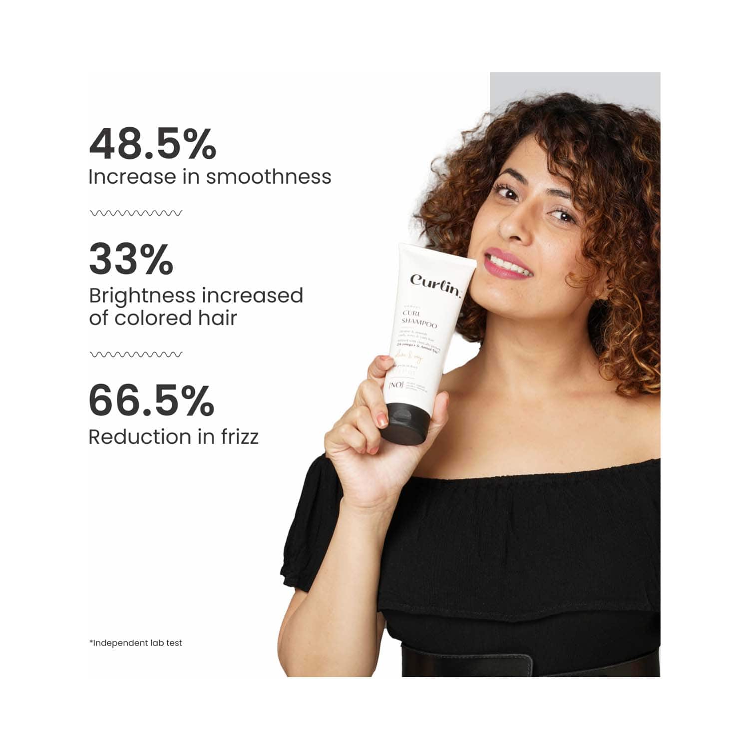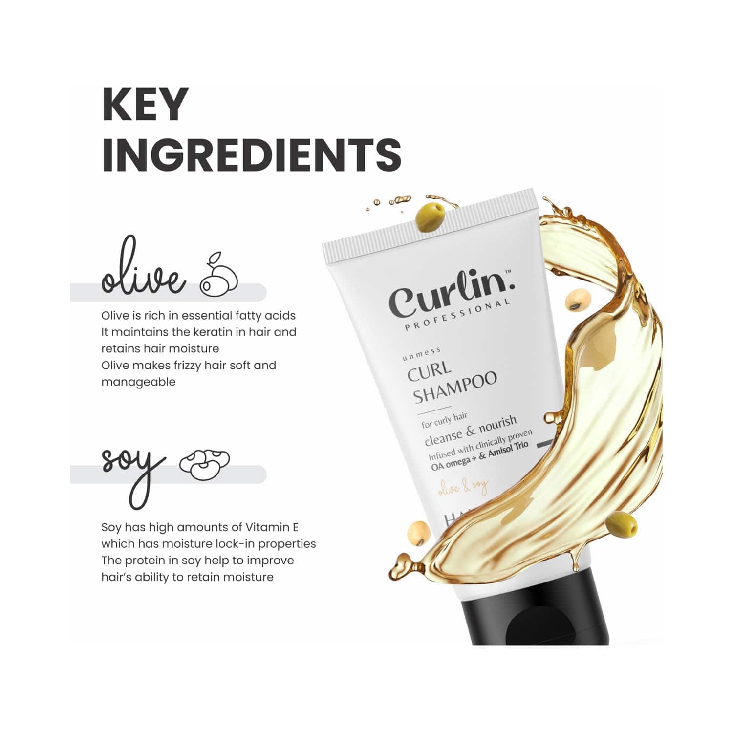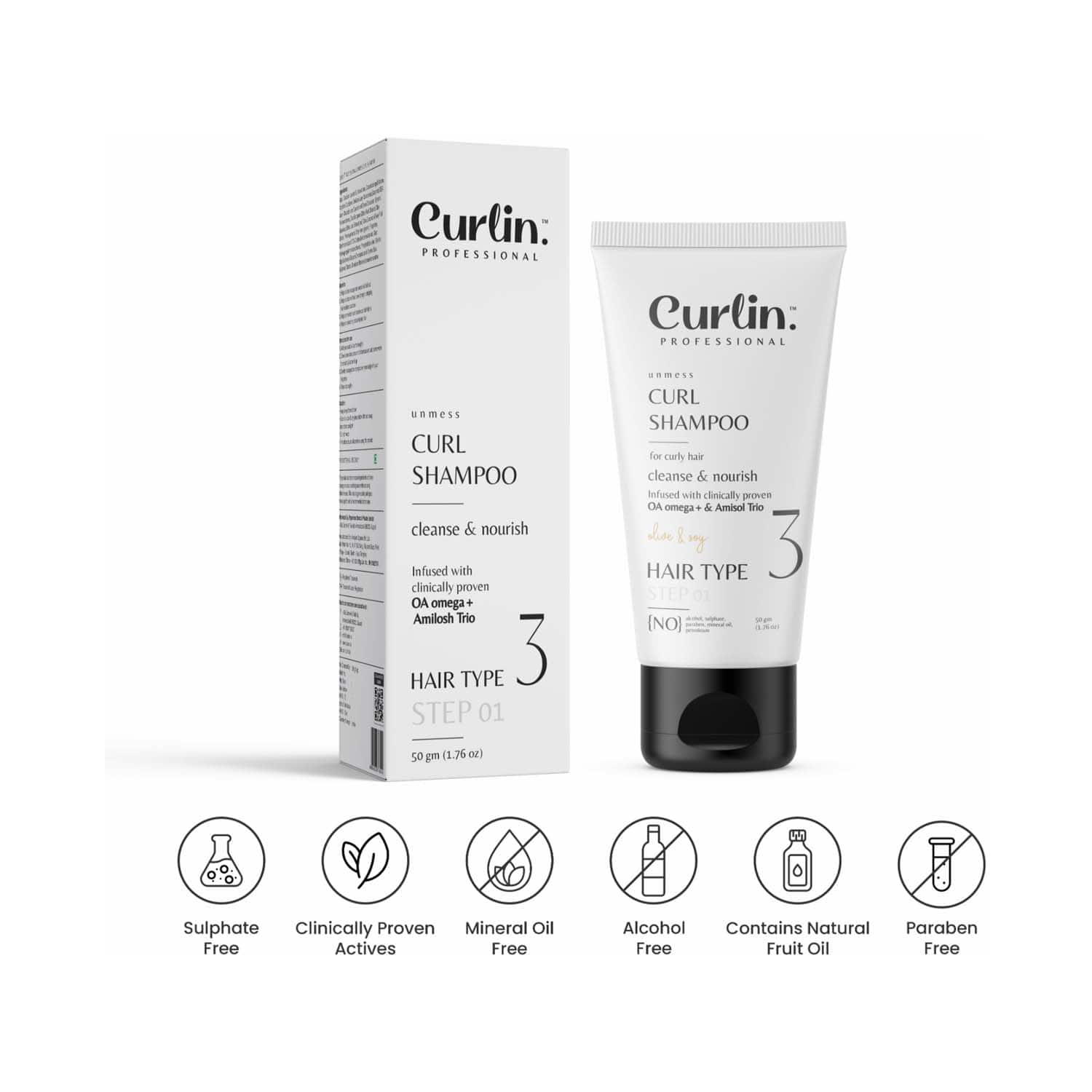 Get gorgeous curly hair naturally with the Curlin Professional Nourishing Curly Hair Shampoo (50 g). This curl-cleansing shampoo is formulated with olive oil and vitamin E that repair and restore hair's natural shine. The Curlin Professional hair shampoo is enriched with oa omega+ that revitalizes dull and damaged curls. Plus, this gentle curly hair shampoo is infused with olive and soy extracts that cleanse without drying the hair. Key Features & Benefits:Contains the goodness of oa omega+ that repairs damaged curlsFormulated with olive and soy extracts that cleanse without drying the hairInfused with vitamin E that nourishes and softens the hairContains no nasty chemicals or harsh agents that may damage curly hair Key Ingredients:Olive extracts: Soften the hairSoy extracts: Cleanse without dryingOa omega+: Contains essential omega fatty acids for hair nourishmentVitamin E: Repairs damaged hair All Ingredients:Oa Omega+, Amisol Trio, Olive, Soy How to Use:Wet your hair. Take a sufficient amount of the shampoo in your palm and apply it to your hair. Massage the product into your hair to create a lather, then wash it off thoroughly. Repeat the process if required. About the Brand:Founded by Sumit Karanji, Curlin Professional is a hair care brand offering products specially developed for curly hair. Their product line includes shampoos, conditioners, hair masks, combo, and more. The brand aims to simplify hair care for curly heads with its easy-to-use and affordable products. Each product of Curlin Professional is developed after meticulous research and features clinically proven ingredients that are safe and effective for use on curly hair.