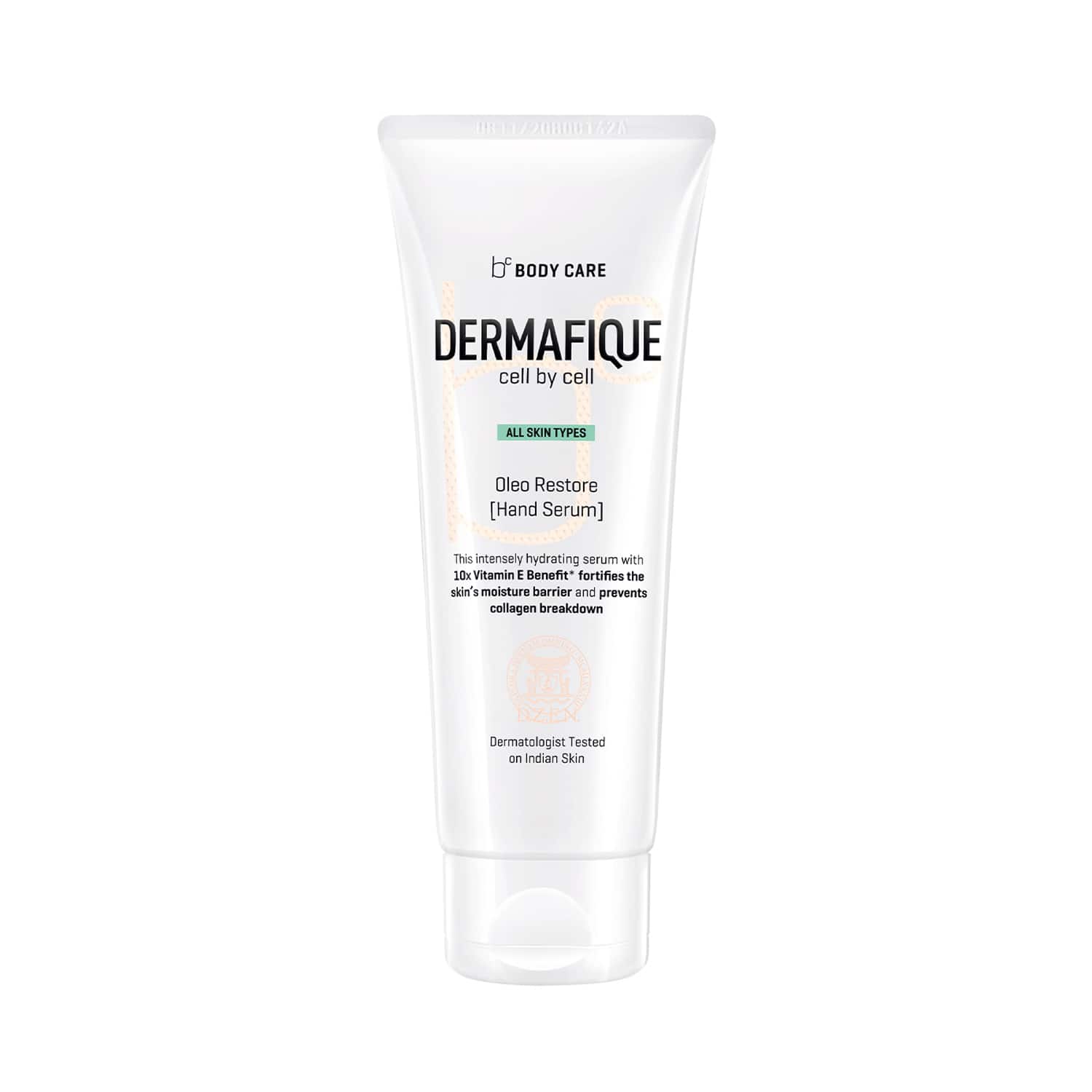 Get soft and supple hands with the Dermafique Oleo Restore Hand Serum (50g). This vitamin E hand serum maintains the skin's moisture barrier and prevents collagen synthesis. It is a hydrating serum that keeps the skin hydrated. The Dermafique hand serum is also a moisturizing serum that heals rough and dry skin.Key Features & Benefits:Infused with olive oil to nourish the skinMoisturizing hand serum balances moisture barrierNon-greasy texture easily melts into the skinDermatologically tested hand serum for safe useKey Ingredients:Vitamin E and olive oil: Moisturize the skinAll Ingredients:Aqua, Glycerin, Mineral Oil, Steareth-21, Acrylates/Acrylamide Copolymer, Polysorbate 85, Isohexadecane, Cetyl Alcohol, Cyclopentasiloxane, Dimethiconol, Dimethicone Crosspolymer & Phenyl Trimethicone Blend, Steareth-2, Isopropyl Palmitate, Ppg-15 Stearyl Ether, Ethylhexyl Methoxycinnamate, Glycol Distearate, Petrolatum, Olea Europaea (Olive) Fruit Oil (And) Hydrogenated Olive Oil, Tocopheryl Acetate, Phenoxyethanol, Methylparaben, Disodium Edta, Propylparaben, Fragrance, Alpha-Isomethyl Ionone, Amyl Cinnamal, Butylphenyl Methylpropional, Citronellol, Hexyl Cinnamal, Isoeugenol, LinaloolHow to Use:Wash your hands and dry them. Then, apply an adequate amount of the hand serum and massage it into the skin until fully absorbed.About the Brand:Dermafique is an integral, intelligent skin care system that combines active ingredients and scientific innovations jointly developed by the expertise of dermatologists and cell biologists. Dermafique works with skin physiology to address skin problems that internal or external factors may cause. Healthy skin is built cell by cell, step by step, using proper skin care methods backed by science and skin-friendly products. This philosophy has led us to create Dermafique, a premium skincare brand specially formulated for Indian skin.Check out more Dermafique Body Lotions & Moisturisers options here, or browse through tokocart's full range of Body Lotions & Moisturisers from top global brands.You can also explore other products from the world of Dermafique here on tokocart.