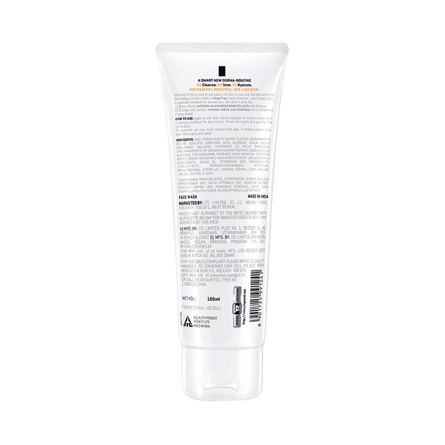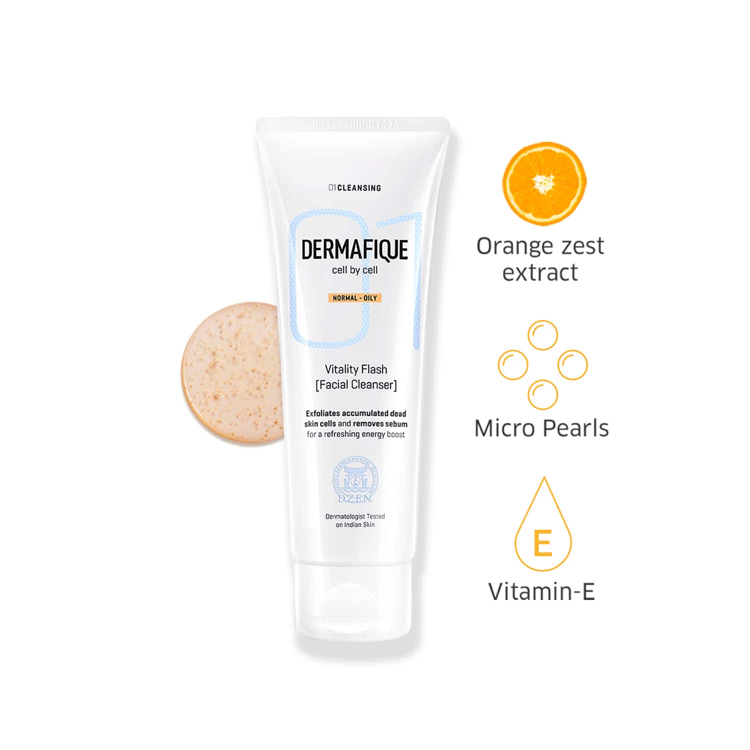 Get a natural glowing face with the Dermafique Vitality Flash Facial Cleanser (100ml). This jojoba oil face cleanser removes excess oil and dirt from the skin to clear pores. It is an exfoliating facewash that buffs away dead skin cells. The Dermafique facewash is also a moisturizing face cleanser that locks moisture in the skin.Key Features & Benefits:Infused with orange zest extract to exfoliate the skinRemoves pollution, dirt, and excess oil for clear skinNourishing facewash cleanses the skin without stripping moistureFree from soap for safe useKey Ingredients:Orange zest extract: Removes excess oilJojoba oil: Nourishes the skinAll Ingredients:Aqua, Sodium Laureth Sulfate, Glycerin, Cocamidopropyl Betaine, Acrylates Copolymer, Decyl Glucoside, Sodium Lauroyl Sarcosinate, Cellulose, Polysorbate 20, Peg-12 Dimethicone, Linoleamidopropyl Pg-Dimonium Chloride Phosphate, Disodium Cocoyl Glutamate, Triethanolamine, Fragrance, Dmdm Hydantoin, Tocopheryl Acetate, Orange Zest Extract, Mixed Plant Extracts*, Benzophenone-4, Hydrogenated Jojoba Oil, Tetrasodium Edta, Pentaerythrityl Tetra-Di-T-Butyl Hydroxyhydrocinnamate, Butylphenyl Methylpropional, Citronellol, Limonene, Geraniol, Hexyl Cinnamal, Linalool, Ci 14700, Ci 19140, * Contains Aqua, Propylene Glycol, Ethoxydiglycol, Glucose, Aesculus Hippocastanum Seed, Salvia Officinalis Leaf, Equisetum Arvense, Tussilago Farfara Leaf, Rosmarinus Officinalis, Urtica Dioica, Chamomilla Recutita Flower, Melissa Officinalis Leaf ExtractsHow to Use:Take a small amount of facewash and apply it to the dampened face. Lather and eventually rinse with water. Use regularly for good results.About the Brand:Dermafique is an integral, intelligent skin care system that combines active ingredients and scientific innovations jointly developed by the expertise of dermatologists and cell biologists. Dermafique works with skin physiology to address skin problems that internal or external factors may cause. Healthy skin is built cell by cell, step by step, using proper skin care methods backed by science and skin-friendly products. This philosophy has led us to create Dermafique, a premium skincare brand specially formulated for Indian skin.