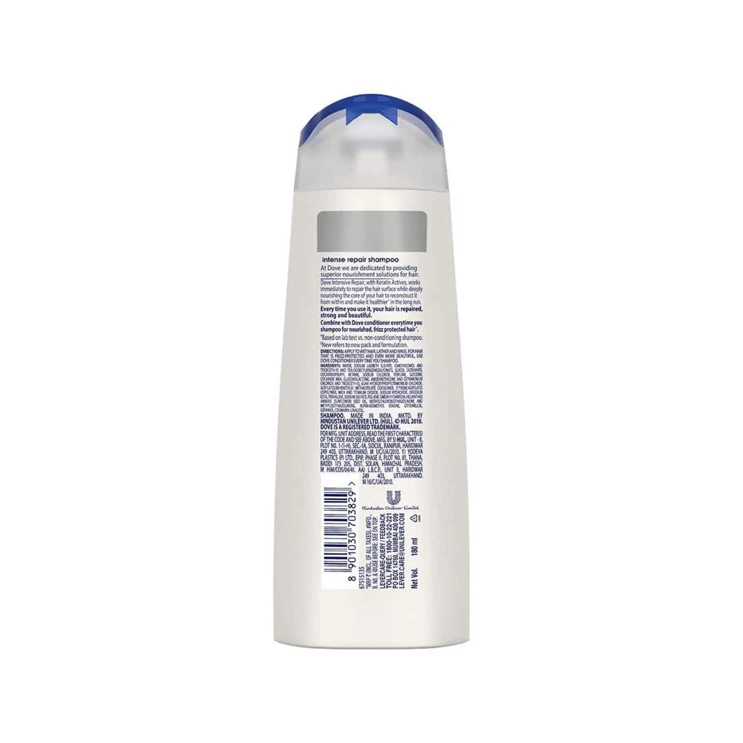 Bid farewell to split ends and damaged hair with the Dove Intense Repair Hair Shampoo - (180ml). This nourishing shampoo is rich in keratin actives that help to repair hair damage with every use. It nourishes your hair from within and makes it healthy. This Dove shampoo is paraben-free and cruelty-free for safe and reliable use.Formulated with keratin actives to repair damaged hairEffectively nourishes and promotes healthy hair growthHelps in strengthening hairParaben-free and cruelty-free shampoo for safe useSunflower seed oil: Reduces dandruff and promotes healthy hair growthGlycerin: Moisturises and conditions the hairWater, Sodium Laureth Sulfate, Dimethiconol And Trideceth-10 And Tea-Dodecylbenzenesulfonate, Glycol Distearate, Cocamidopropyl Betaine, Sodium Chloride, Perfume, Glycerin, Cocamide Mea, Amodimethicone And Cetrimonium Chloride And Trideceth-12, Guar Hydroxypropyltrimonium Chloride, Acrylates/Beheneth-25 Methacrylate Copolymer, Styrene/Acrylates Copolymer, Mica And Titanium Dioxide, Sodium Hydroxide, Disodium Edta, Gluconolactone, Trehalose, Adipic Acid, Sodium Sulfate, Peg-45M, Dmdm Hydantoin, Helianthus Annuus (Sunflower) Seed Oil, Methylchloroisothiazolinone And Methylisothiazolinone, Alpha-Isomethyl Ionone, Citronellol, Geraniol, LinaloolTake a dollop of the shampoo and gently massage it on your wet scalp to create a lather. Then wash off this lather with lukewarm water for a clean and healthy scalp.Founded by the Lever brothers in 1957, Dove is a personal care brand that offers a wide range of facial and hair care products. The brand aims at redefining beauty standards and making beauty a source of confidence, not anxiety. With the launch of the Dove Self-Esteem Project in 2004, the brand continues to deliver self-esteem education to help young people realise their true beauty in being themselves. Dove has carefully curated products that are cruelty-free to ensure safe and reliable use for the millions of customers they cater to.Check out more Dove Shampoo options here, or browse through tokocart's full range of Shampoo from top global brands.You can also explore other products from the world of Dove here on tokocart.