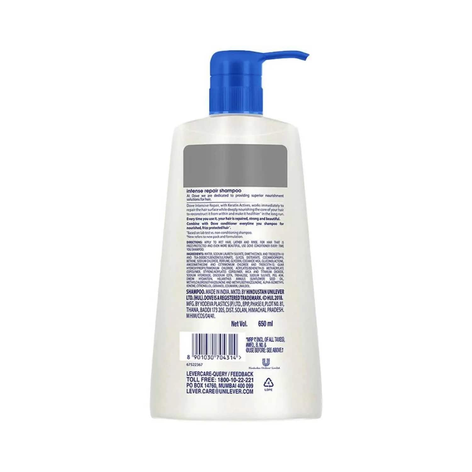 Nourish your hair with the Dove Intense Repair Hair Shampoo - (650ml). This nourishing shampoo is rich in keratin actives that help to repair hair damage with every use. It nourishes your hair from within and makes it healthy. This Dove shampoo is paraben-free and cruelty-free for safe and reliable use.Formulated with keratin actives to repair damaged hairEffectively nourishes and promotes healthy hair growthHelps in strengthening hairParaben-free and cruelty-free shampoo for safe useSunflower seed oil: Reduces dandruff and promotes healthy hair growthGlycerin: Moisturises and conditions the hairWater, Sodium Laureth Sulfate, Dimethiconol And Trideceth-10 And Tea-Dodecylbenzenesulfonate, Glycol Distearate, Cocamidopropyl Betaine, Sodium Chloride, Perfume, Glycerin, Cocamide Mea, Amodimethicone And Cetrimonium Chloride And Trideceth-12, Guar Hydroxypropyltrimonium Chloride, Acrylates/Beheneth-25 Methacrylate Copolymer, Styrene/Acrylates Copolymer, Mica And Titanium Dioxide, Sodium Hydroxide, Disodium Edta, Gluconolactone, Trehalose, Adipic Acid, Sodium Sulfate, Peg-45M, Dmdm Hydantoin, Helianthus Annuus (Sunflower) Seed Oil, Methylchloroisothiazolinone And Methylisothiazolinone, Alpha-Isomethyl Ionone, Citronellol, Geraniol, LinaloolTake a dollop of the shampoo and gently massage it on your wet scalp to create a lather. Then wash off this lather with lukewarm water for a clean and healthy scalp.Founded by the Lever brothers in 1957, Dove is a personal care brand that offers a wide range of facial and hair care products. The brand aims at redefining beauty standards and making beauty a source of confidence, not anxiety. With the launch of the Dove Self-Esteem Project in 2004, the brand continues to deliver self-esteem education to help young people realise their true beauty in being themselves. Dove has carefully curated products that are cruelty-free to ensure safe and reliable use for the millions of customers they cater to.Check out more Dove Shampoo options here, or browse through tokocart's full range of Shampoo from top global brands.You can also explore other products from the world of Dove here on tokocart.