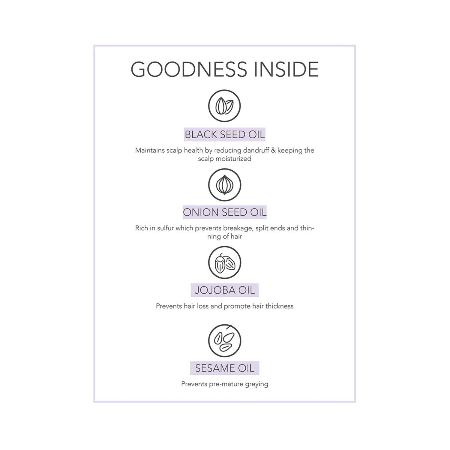 Key Features & Benefits:Infused with a blend of natural oils, including brahmi, bhringraj, amla, onion, sweet almond, and jojoba oil for intense nourishmentContains redensyl to stimulate hair follicles and improve hair growthContains biotin to fortify the hair strandsGrowth-stimulating and conditioning oil for thick, voluminous hair
