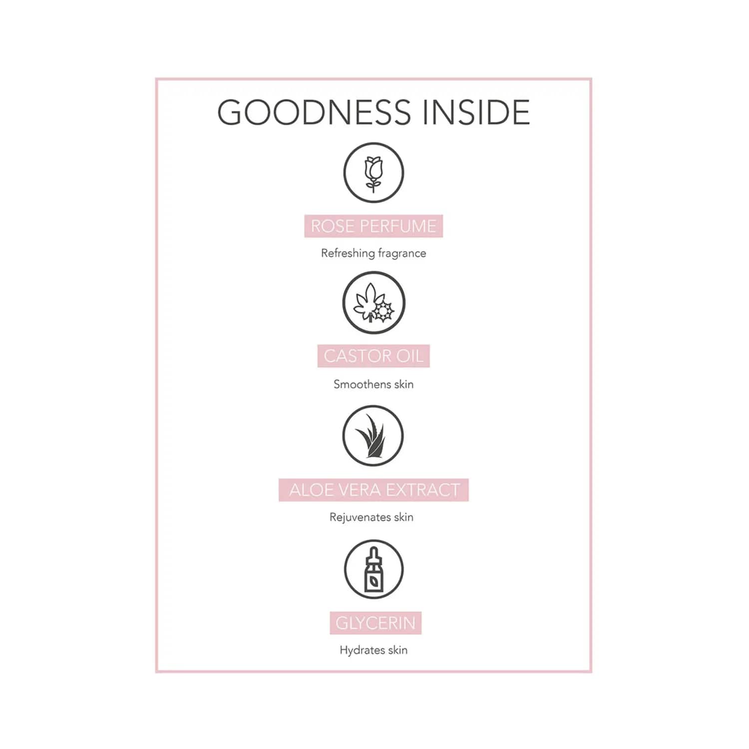 Key Features & Benefits:Enriched with castor oil to give smooth skinInfused with aloe vera extracts to invigorate tired skinFormulated with glycerine to hydrate skinRose perfume added to refresh with a sweet aromaCruelty-free and paraben-free for safe and reliable use