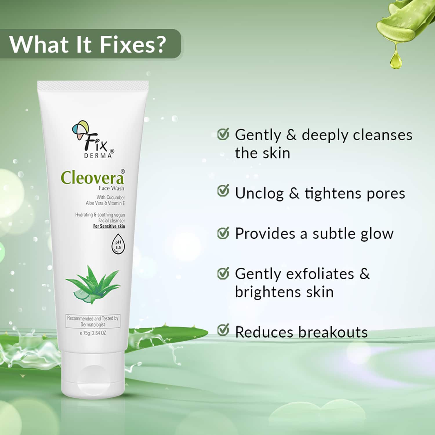 Say bye-bye to dullness and hello to a glowing complexion with the Fixderma Cleovera & Cucumber Facewash with Vitamin E (75g). This aloe vera facewash unclogs skin pores and clears dead skin cells. It is a hydrating facewash that locks moisture in the skin. The Fixderma facewash is also a brightening face cleanser that reduces breakouts.