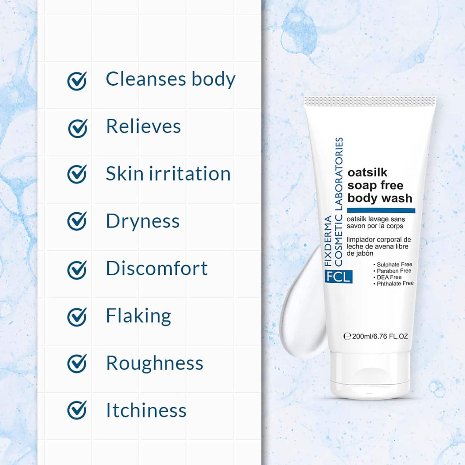 This nourishing body wash helps to relieve all symptoms of skin irritation, dryness, discomfort, flaking, roughness and itchiness. It contains 100% natural Colloidal Oatmeal Free from common irritants. pH balanced formulation which offers perfect skin cleansing without irritating it. KEY INGREDIENTS Colloidal Oat Complex (Oatsilk) Linoleic acid Sodium PCA INDICATIONS: Psoriasis Dry to very dry skin Skin allergic to soaps Sensitive skin Keratosis pilaris Atopic dermatitis Itchy dry skin. DIRECTIONS FOR USE Pump out a sufficient amount to apply any our body. Rinse off leaving your skin clean and moisturized. Why We Are Different? Eco Cert/Cosmos (US) certified Colloidal Oatmeal organic version Offers complete cleansing without drying the skin. pH balanced formulation Soap free Decreases scaliness & maintains the surface acid mantle. Suitable for all skin types.Key Features & BenefitsSOOTHING & MOISTURIZING: Specially formulated to sooth & moisturize itchy dry & sensitive skinMAINTAINS pH OF THE SKIN: Decreases scaliness & maintains the surface acid mantleCLEAN FORMULATION: Sulphate Free, Paraben Free, DEA Free, Phthalate FreeKEY INGREDIENTS: Colloidal Oat Complex (Oatsilk), Sodium PCA, Linoleic acid.DIRECTIONS FOR USE: Take adequate amount on your hand, rub over the entire body & rinse. Apply twice a day for the best resultsKey Ingredients:Linoleic acid: Hydrates skinAll Ingredients:Aqua, Cocamidopropyl Betaine, Sodium Lauroyl Sarcosinate, Glycerol, Aloe Barbadensis (Aloe) Leaf Juice, Peg-50 Shea Butter, Cocamidopropyl Pg-Dimonium Chloride, Aqua, Glycol Stearate, Laureth-4, Cocamidopropyl Betaine, Caprylhydroxamic Acid, Caprylyl Glycol, Glycerin, Cocamidopropyl Pg-Dimonium Chloride Phosphate, Polysorbate-20, Xanthan Gum, Avena Sativa (Oat) Meal Extract, Sodium Pca, Fragrance.How to Use:Apply enough body wash to the pump, covering your entire body. Cleanse off with water.About the Brand:Founded in 2006, Fixderma Cosmetic Laboratories is an innovative cosmeceutical company with a mission to improve people's skin health. Their skincare philosophy is based on three main pillars, i.e., prevent, protect, and correct. Fixderma has developed cutting-edge products with rich formulations, each consisting of clinically proven active ingredients that bolster skincare efficacy. Also, all their products are tested by dermatologists to ensure proper effectiveness towards any skin problem without any compromise.Check out more Fixderma Cosmetic Laboratories Body Wash & Shower Gel options here, or browse through tokocart's full range of Body Wash & Shower Gel from top global brands.You can also explore other products from the world of Fixderma Cosmetic Laboratories here on tokocart.