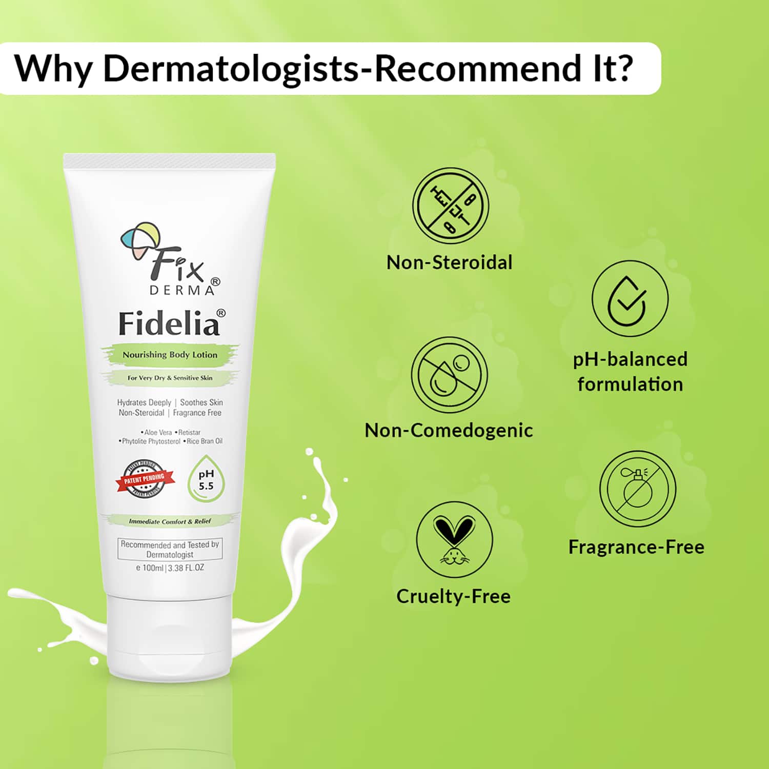 The Fixderma Fidelia Nourishing Body Lotion for Sensitive & Very Dry Skin with Rice Brain Oil & Aloe Vera (100ml) is the perfect companion for your daily skincare ritual. This aloe vera body lotion retains moisture in the skin and maintains the skin's pH level. It is an age-defying lotion that reduces early signs of aging. The Fixderma body lotion is also a soothing lotion that calms skin irritation and itchiness.Key Features & Benefits:Infused with rice bran oil to lock moisture in dry skinNourishing body lotion prevents skin dryness and flakinessLightweight lotion for fast absorption into the skinFree from sulfate and allergen for safe useKey Ingredients:Aloe vera: Fights signs of agingRice bran oil: Moisturizes the skinAll Ingredients:Retistar + Aloe Vera + Rice Bran Oil+ Phytolite PhytosterolHow to Use:Wash your skin. Take a bit of the lotion and put it on your skin. After that, massage well for increased hydration. Apply twice daily for the best results.About the Brand:Fixderma is a leading cosmetics company founded in 2006 with an innovative vision in skin care. They work efficiently in this field, gradually establishing themselves as a well-known manufacturer and supplier of cosmetics worldwide. The brand focuses on manufacturing, marketing, and promoting innovative dermatology products in India and exports them to over 30 countries worldwide. Fixderma has made a name for itself by producing high-quality, results-oriented products that have made a distinct difference to the skin care products on the market.Check out more Fixderma Body Lotions & Moisturisers options here, or browse through tokocart's full range of Body Lotions & Moisturisers from top global brands.You can also explore other products from the world of Fixderma here on tokocart.