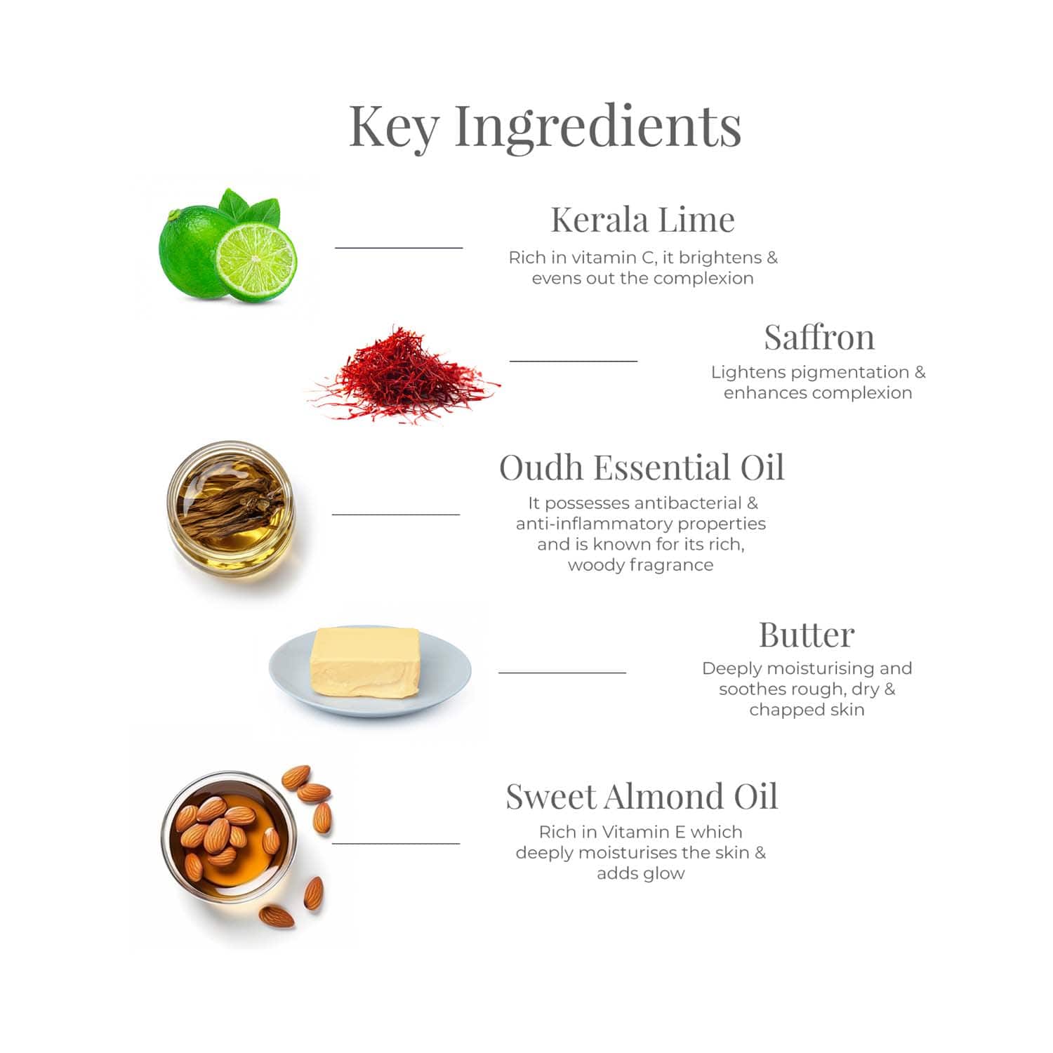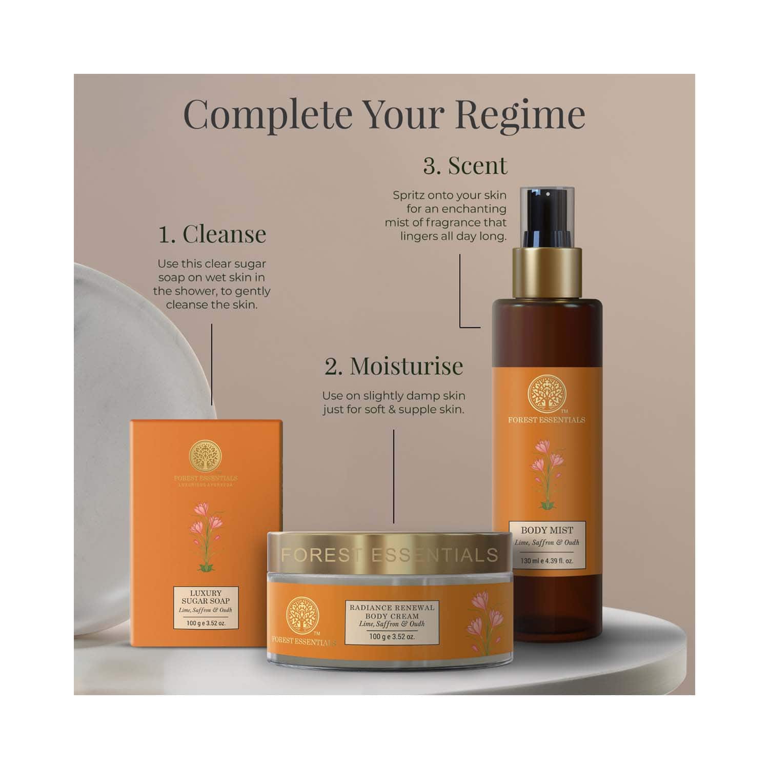 Pamper your skin with the Forest Essentials Radiance Renewal Lime Saffron and Oudh Ayurvedic Body Cream (100 g). Infused with zesty lime, warm saffron, and grounding Oudh, this fragrant body cream delicately envelops your skin with a long-lasting freshness. Enriched with the goodness of wheat germ oil, aloe vera, Kashmiri saffron, and nourishing cocoa and shea butter, this Forest Essentials Ayurvedic body cream provides deep hydration and nourishment while boosting your skin's natural elasticity.Key Features & Benefits:Formulated with a blend of lime, saffron, and Oudh to deeply hydrate your skinWheat germ oil and sweet almond oil soften the skinStimulates the regeneration of skin cells while providing intense nourishmentMade with aloe vera to soothe and protect your skinKey Ingredients:Wheat germ oil: Nourishes and maintains skin healthAloe vera: Calms and hydrates your skinOudh oil: Has a unique earthy fragranceKashmiri saffron: Purifies your skin and imparts a brilliant complexionAll Ingredients:Wheat Germ Oil, Aloe Vera, Oudh Essential Oil, Kashmiri Saffron, Sweet Almond Oil, Shea ButterHow to Use:Use after a bath, steam, or spa treatment to soften, nourish, and leave the skin with a satin sheen.About the Brand:Established in 2000 by Mira Kulkarni in New Delhi, India, Forest Essentials is an authentic and traditional skin and hair care brand. They create formulas rooted in the ancient science of Ayurveda. The quintessential beauty brand combines the ancient beauty rituals of Ayurveda with a stylish, modern aesthetic to deliver highly effective products to its consumers. They believe that beauty products made out of living substances, such as plants and their extracts, are balanced by nature and possess the vibratory energy that makes up life. All of their products, from kajals, shampoos, conditioners, body mists, serums, and cheek tints, to baby powder, contain all the purifying, nourishing, and balancing properties necessary to nurture the skin and for eternal beauty.