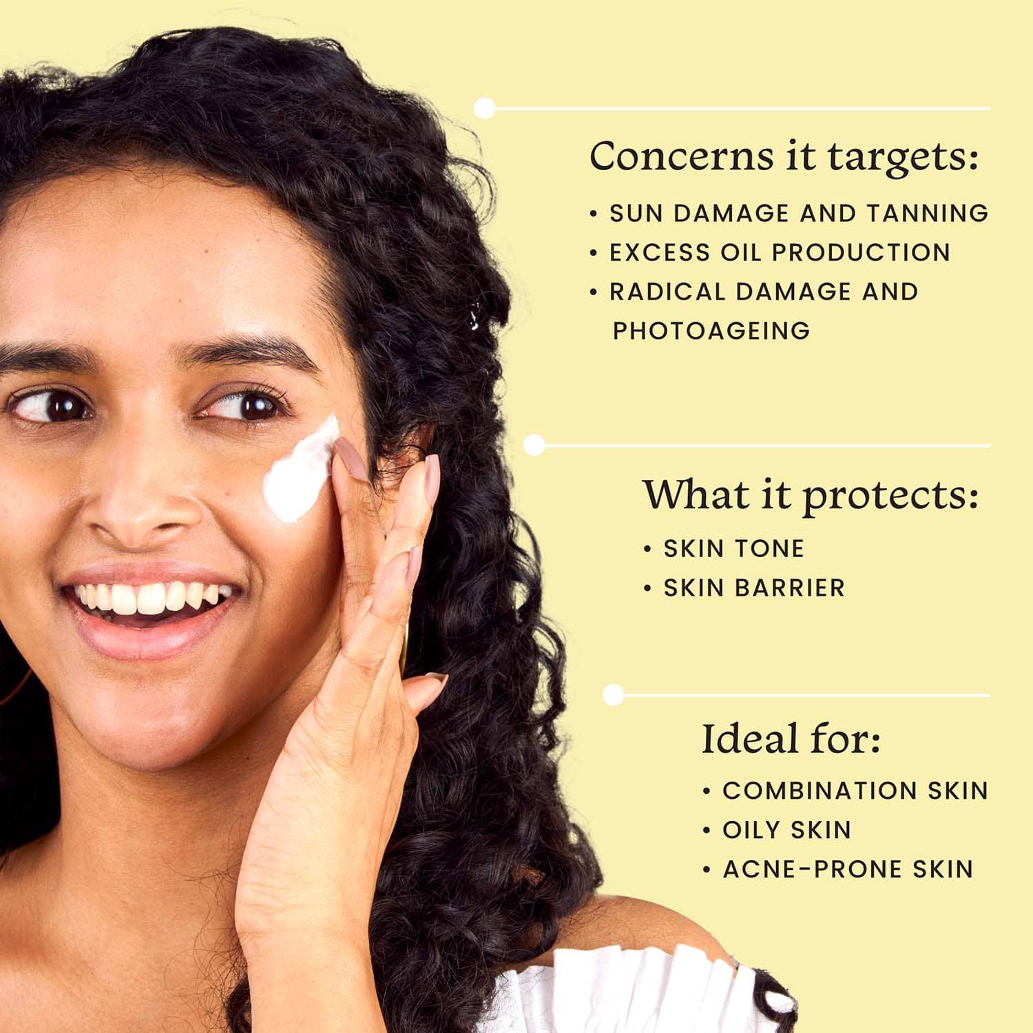 Key Features & Benefits:Infused with niacinamide to improve the skin texture and lighten dark spotsHas SPF 70 PA++++ for broad spectrum protection from the sun rays and blue lightOil-controlling formula leaves behind a matte finishVegan, cruelty-free, and dermatologically tested sunscreen does not have sulfate to ensure safe use on all skin types