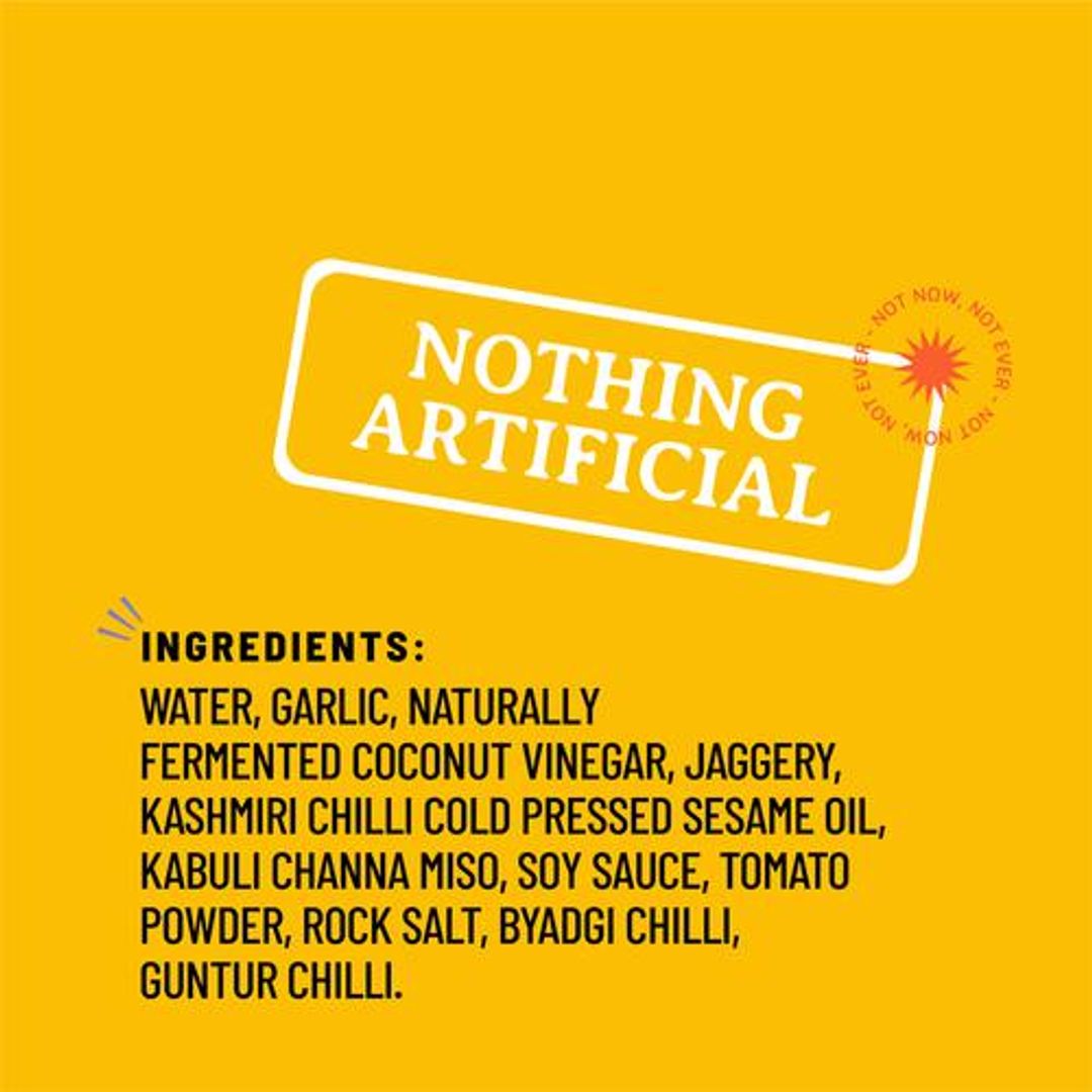 Water, Garlic, Naturally Fermented Coconut Vinegar, Jaggery, Kashmiri Chilli, Cold Pressed Sesame Oil, Kabuli Chana Miso, Soy Sauce, Tomato Powder, Rock Salt, Byadgi Chilli, Guntur Chilli.