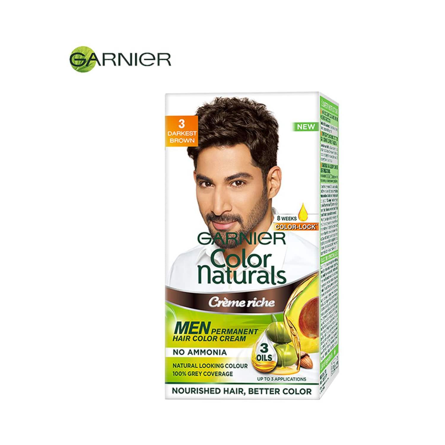Get stylish-looking hair with the Garnier Color Naturals Men Creme Riche Hair Colour - 3 Darkest Brown (30ml+30g). It is a permanent hair coloring cream that helps to color grey hair and offers a healthy look. This Garnier hair color cream contains three natural oils that condition and nourishes your hair. The hair color for men has an easy-to-apply formula and provides a comfortable application. You can safely use this ammonia-free hair color cream to ensure zero damage to your hair. Key Features & Benefits:Formulated with three natural oils that condition and nourish your hairHelps to color grey hair and offers a healthy lookNatural-looking hair color makes your hair softMade with superior color lock technology to provide long-lasting color that stays for up to 8 weeksEasily applicable formula that ensures comfortable useAmmonia-free formula provides zero damage to your hair All Ingredients:Olive, Almond, Avocado. How to Use:Wear the gloves provided and mix the colorant and developer in a non-metallic bowl in a 1:1 ratio. Now part your hair into sections, apply the hair color from the root, and work your way towards the tip. Let it rest for 30 minutes. Rinse thoroughly with water, apply conditioner and wash again. About the Brand:Founded in France in 1904, Garnier is one of the world's leading skincare and haircare brands. Since then, Garnier has been at the forefront of research to infuse natural ingredients into its skin care and hair care lines, staying true to its motto: By Garnier, Naturally. Garnier is committed to sustainable sourcing, reducing the environmental footprint of packaging, and improving the biodegradability of their formulas to meet the needs of women and men around the world affordably.Check out more Garnier Hair Colour options here, or browse through tokocart's full range of Hair Colour from top global brands.You can also explore other products from the world of Garnier here on tokocart.