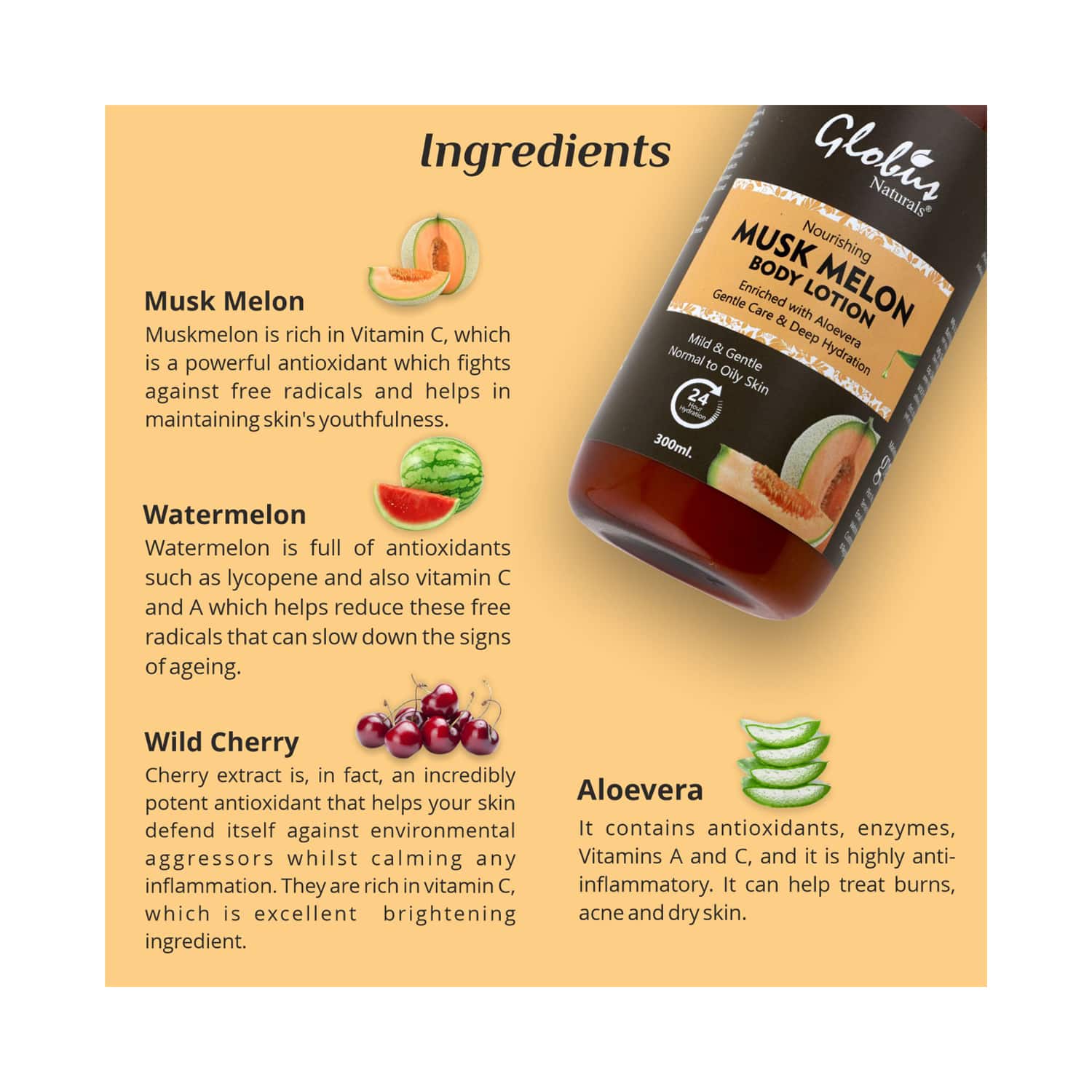 Accentuate your skin's glow with the Globus Naturals Nourishing Muskmelon Body Lotion Enriched With Aloe Vera Gentle Care & Deep Hydration (300ml). This watermelon body lotion locks moisture in dry skin and provides intense hydration. It is a skin-protecting lotion that fights free radical damage. The Globus Naturals body lotion is also a lightweight lotion that does not make the skin greasy.Key Features & Benefits:Enriched with musk melon to treat free radical damageNourishing body lotion unclogs skin poresHydrating lotion moisturizes dry skinFree from paraben for safe useKey Ingredients:Muskmelon: Fights free radical damageWatermelon: Prevents skin agingAloe vera: Moisturizes the skinAll Ingredients:Muskmelon, Wild Cherry, Watermelon & Aloe VeraHow to Use:Wash your skin. Take a bit of the lotion and put it on your skin. After that, massage well for increased hydration.About the Brand:Globus Group is headquartered in New Delhi, India. Dr. Anil Verma, a dedicated and passionate doctor with many years of medical experience, founded the brand. Globus Naturals is a world-class manufacturer of beauty and wellness products, offering various quality products designed to support health from the inside out. They use only the best ingredients and test each product to ensure its effectiveness and safety. Whether you want to improve your skin, boost your energy, or promote health and wellness, their products are the perfect way to harness the power of Ayurveda and experience its benefits.Check out more Globus Naturals Body Lotions & Moisturisers options here, or browse through tokocart's full range of Body Lotions & Moisturisers from top global brands.You can also explore other products from the world of Globus Naturals here on tokocart.