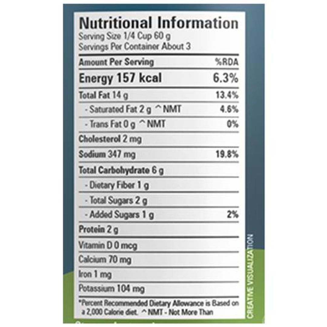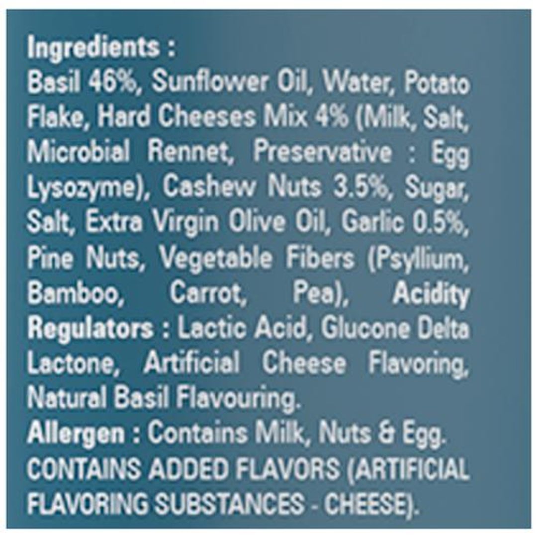 Basil 45.2%, Sunflower Oil, Potato Flakes, Salt, Water, Hard Grating Cheeses (25.%), Cashew Nuts, Sugar, Extra Virgin Olive Oil, Pecorino Romano, Acidity Regulator: Glocon-Delta-Lactone, Antioxidant: Ascorbic Acid, Garlic, Pinenuts 0.1%.