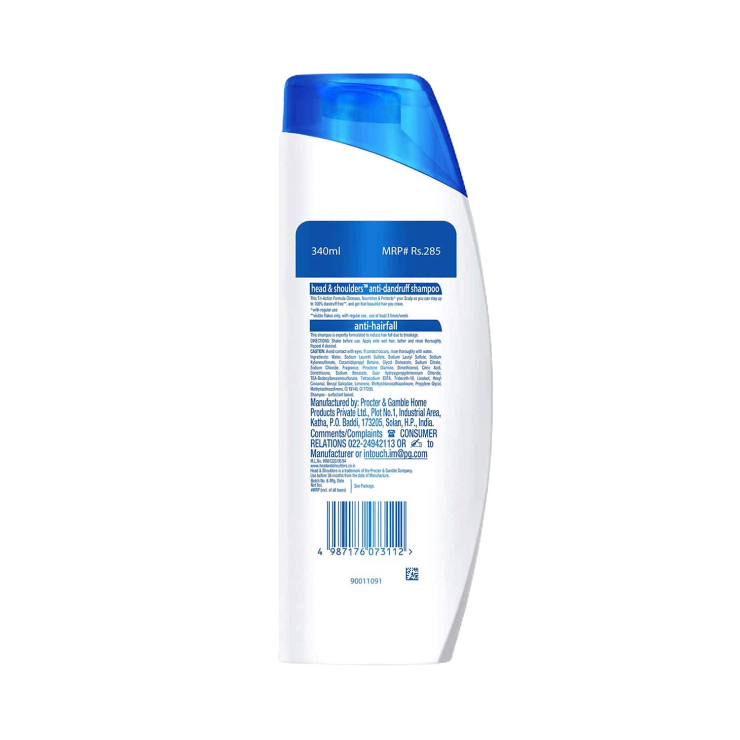 Control dandruff for good with the Head & Shoulders Anti-Hairfall And Anti-Dandruff Shampoo (340ml). This conditioning shampoo gently cleanses and removes flakes and dandruff to leave your hair feeling clean and smooth. Plus, this hydrating shampoo conditions the hair, protects against damage, and reduces dullness and frizz.Key Features & Benefits:Conditions the hair to make it soft and healthyReduces hair fall and breakage for fuller-looking hairMinimizes dandruff to maintain hair healthGentle formula is ideal for everyday useAll Ingredients:Water, Sodium Laureth Sulfate, Sodium Lauryl Sulfate, Glycol Distearate, Zinc Carbonate, Sodium Chloride, Sodium Xylenesulfonate, Cocamidopropyl Betaine, Fragrance, Dimethicone, Sodium Benzoate, Guar Hydroxypropyltrimonium Chloride, Magnesium Carbonate Hydroxide, Methylchloroisothiazolinone, Methylisothiazolinone, Blue 1, Red 33.How to Use:First, wet your hair thoroughly. Then, squeeze the required amount of shampoo on your palm and create a lather by rubbing your hands together. Next, apply the lathered shampoo on your scalp generously. Last, rinse your hair with water and follow by using a conditioner.About the Brand:Head & Shoulders was founded by John Parran Jr under the patent company Procter & Gamble in the year 1961. By 1975, the brand had created a shampoo with a pleasant fragrance that was scientifically proven to remove dandruff. It soon became known as the world's number-one shampoo to remove dandruff, and that is still the case today. Their products include a wide range of shampoos and conditions for various hair issues. Head & Shoulders is dedicated to developing new scientific hair care solutions and aims to promote healthy scalp and great-looking hair.Check out more Head & Shoulders Shampoo options here, or browse through tokocart's full range of Shampoo from top global brands.You can also explore other products from the world of Head & Shoulders here on tokocart.