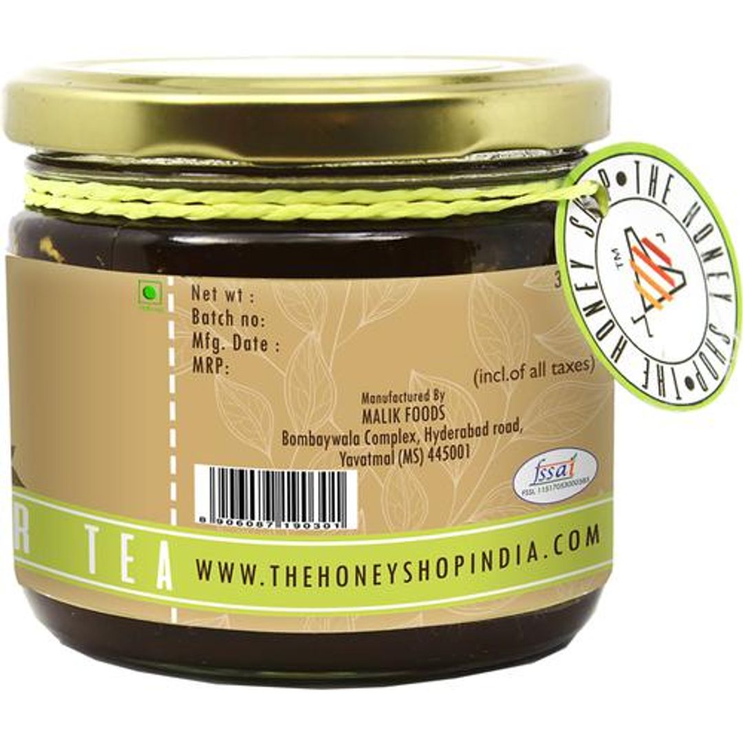 Honey, Ginger, and Ginger Extract Liquid Glucose, Thickening Agent (E440), Acidity Regulator (E330), Tea Leaves Extract & Preservatives (E211).
