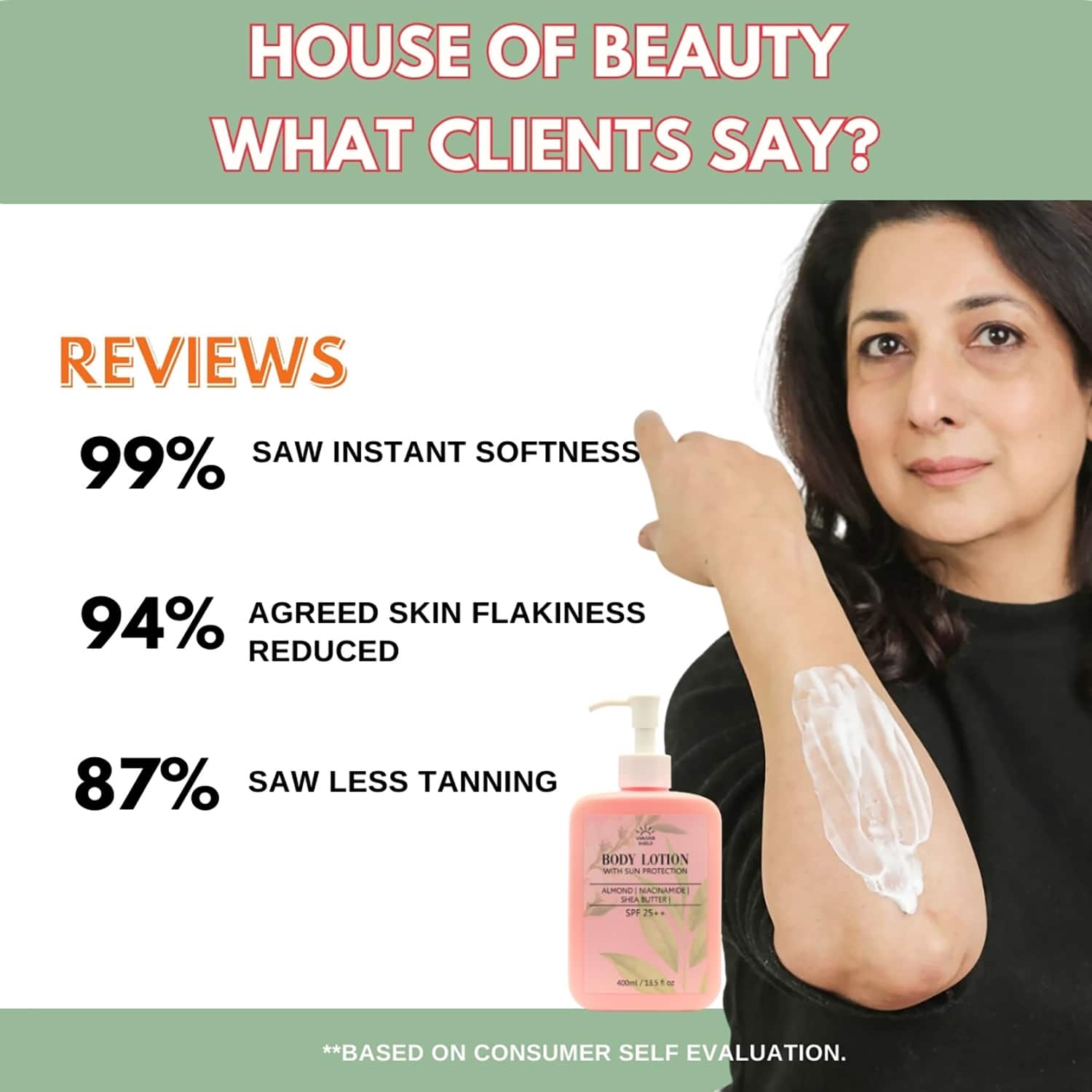 Keep your skin soft, nourished, and protected with the House Of Beauty Body Lotion With SPF 25+ (400ml). This sun-protectant body moisturizer, made with soothing chamomile and green tea, nourishes dehydrated skin while the shea butter, niacinamide, and SPF 50 protect the skin from the sun and environmental damage. Plus, this House Of Beauty body lotion has almond oil, coconut oil, and vitamin E to keep your skin hydrated.Key Features & Benefits:Contains skin-soothing skin chamomile and green teaEnriched with oils of almond and coconut with vitamin E to hydrate the skinHas SPF 50, shea butter, and niacinamide for protection from the sunFeatures the sweet and refreshing scent of arabian oudKey Ingredients:Chamomile and green tea: Nourish and soothe dry skinShea butter and niacinamide: Protect the skin from the sun and environmental damageAlmond oil, coconut oil, and vitamin E: Hydrate the skinAll Ingredients:Shea Butter, Almond Oil, Coconut Oil, Chamomile, Green Tea, Niacinamide, Vitamin EHow to Use:Wash your skin. Take a bit of the lotion and put it on your skin. After that, massage well for increased hydration. Apply twice daily for the best results.About the Brand:Vibhuti and Sumit Arora co-founded HOB Cosmetics P Ltd in 2018 with a mission to ""Revolutionize Skincare"" through the use of face tools, skincare, and face yoga practices. Leading publications like Vogue India, Grazia India, Grazia Italy, Femina India, Cosmopolitan India, and many more have constantly featured the House of Beauty. HOB Cosmetics delivers high-grade DIY tools and skincare to consumers with the utmost care, precaution, and love. HOB Cosmetics uses its knowledge of non-invasive methods of treating various health concerns to improve itself and its products. Its products are natural and safe for anyone to use.Check out more House of Beauty Body Lotions & Moisturisers options here, or browse through tokocart's full range of Body Lotions & Moisturisers from top global brands.You can also explore other products from the world of House of Beauty here on tokocart.