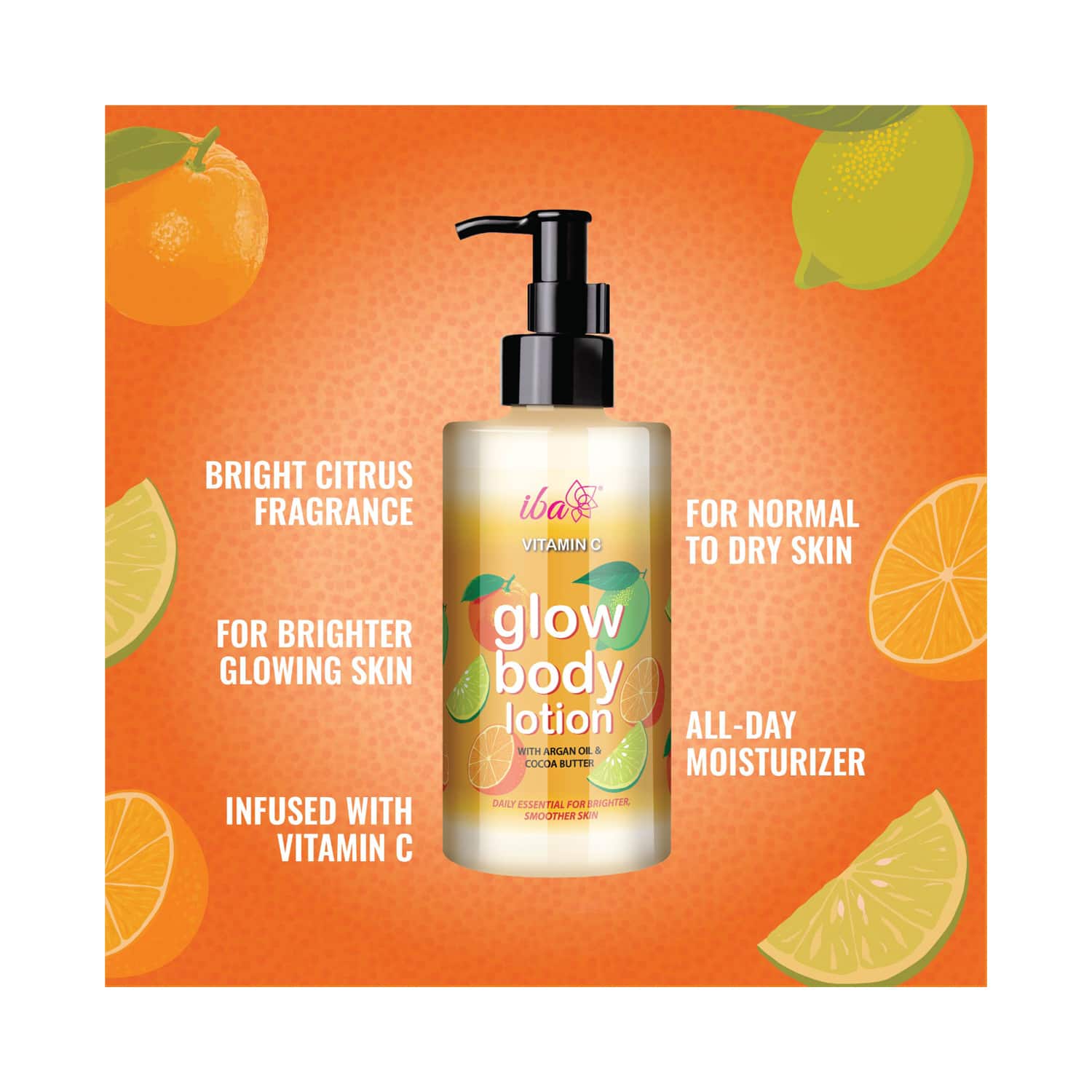 Add a natural glow to dull skin with the Iba Vitamin C Glow Body Lotion (320ml). The argan oil and cocoa butter in this conditioning body lotion works wonders to keep your skin soft and protected while vitamin C brightens the skin. Plus, the Iba body lotion is vegan and free from harmful chemicals to ensure safe use.Key Features & Benefits:Infused with vitamin C to add glow to the skinContains argan oil and cocoa butter to hydrate and reduce drynessFormulated to suit normal and dry skin typesVegan, cruelty-free, and does not contain mineral oil and alcohol for risk-free useKey Ingredients:Vitamin C: Adds glow to the skinArgan oil and cocoa butter: Hydrate and reduce drynessAll Ingredients:Dm Water, Glycerine, Isopropyl Myristate, Polyacrylamide & C13-14 Isoparaffin & Laureth-7, Phenoxyethanol And Triethylene Glycol, Theobroma Cacao( Cocoa Seed) Butter, Tocopheryl Acetate (Vitamin E), Citrus Sinensis (Orange Peel) Extract, Prunus Amygdalus (Sweet Almond) Oil, Polyacrylate Crosspolymer-6, Argania Spinosa Kernel (Argan) Oil, Butylated Hydroxytoluene, Perfume, Magnesium Ascorbyl Phosphate (Vitamin C), Emblica Officinalis (Gooseberry Fruit) Extract, Citrus Limon Peel (Lemon Peel) Extract, Disodium Edta, Citric Acid, Ci-15985How to Use:After bathing, apply the body lotion all over your body and massage it into your skin using slow, circular movements.About the Brand:Iba Cosmetics was founded by Mauli Teli and Grishma Teli in the year 2014 to provide eco-ethical personal care products. Their products include face wash, body wash, foundation, compact, and much more. Iba Cosmetics is dedicated to providing the highest quality products that are safe, effective, and pure. That's why they carefully select only the finest ingredients, ensuring that every product is free from harsh chemicals or harmful toxins.Check out more Iba Body Lotions & Moisturisers options here, or browse through tokocart's full range of Body Lotions & Moisturisers from top global brands.You can also explore other products from the world of Iba here on tokocart.