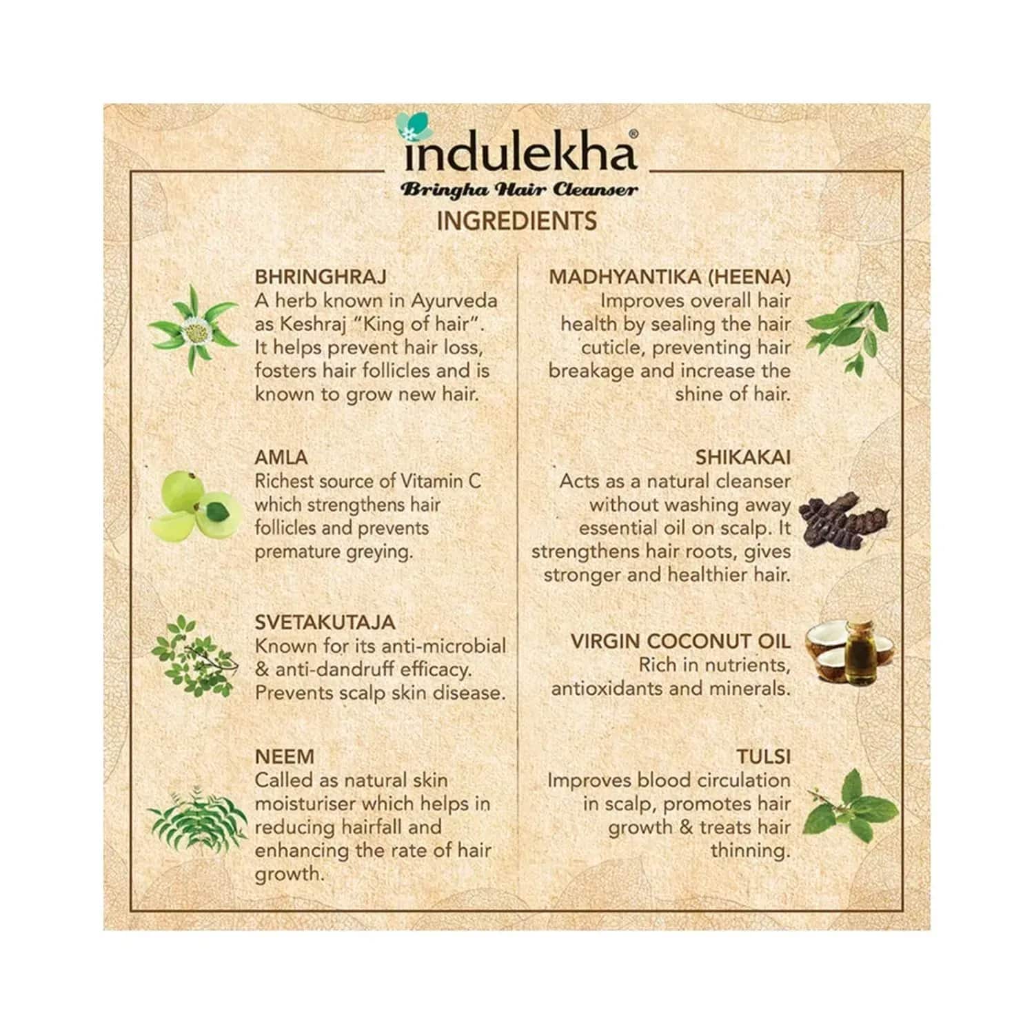 Get healthier hair with the Indulekha Bringha Shampoo (340 ml). This ayurvedic shampoo is infused with nine Bhringraj plant extracts, six herbs and essential oils to reduce hairfall. The herbal shampoo contains neem, shikakai, tulsi, and amla to increase blood circulation to the scalp and promote thicker, stronger hair.Key Features & Benefits:Enriched with nine Bhringraj plant extracts, six herbs, and essential oils to minimise hairfallContains neem, shikakai, tulsi, and amla to promote blood circulation to the scalp and fortify hair folliclesFormulated with herbal ingredients and contains 100% natural colour and fragranceFree of parabens, sulfates, silicones, synthetic dyes and synthetic perfume for safe useKey Ingredients:Bhringraj, amla, vitamin C, vatadha, and svetakutaja: Promote hair growth, reduce hair fall, increase blood circulation, nourish, and protect the scalpHow to Use:Wet your hair and apply shampoo to your scalp. Work the shampoo into your hair and massage it in for 30 seconds. Rinse thoroughly with warm water.All Ingredients:Bhringraj, Amalaki, Tulsi, Neem, Henna, Shikakai, Rosemary OilAbout the Brand:Founded in 2009, Indulekha is an Indian hair care brand headed by Hindustan Unilever Limited. The brand uses the wisdom of ancient Ayurveda practices to solve hair-related problems. Their products include hair oils, serums, cleanser, lepams, and many more. The brand develops hair care products with hand-picked herbs that are safe and effective.Check out more Indulekha Shampoo options here, or browse through tokocart's full range of Shampoo from top global brands.You can also explore other products from the world of Indulekha here on tokocart.