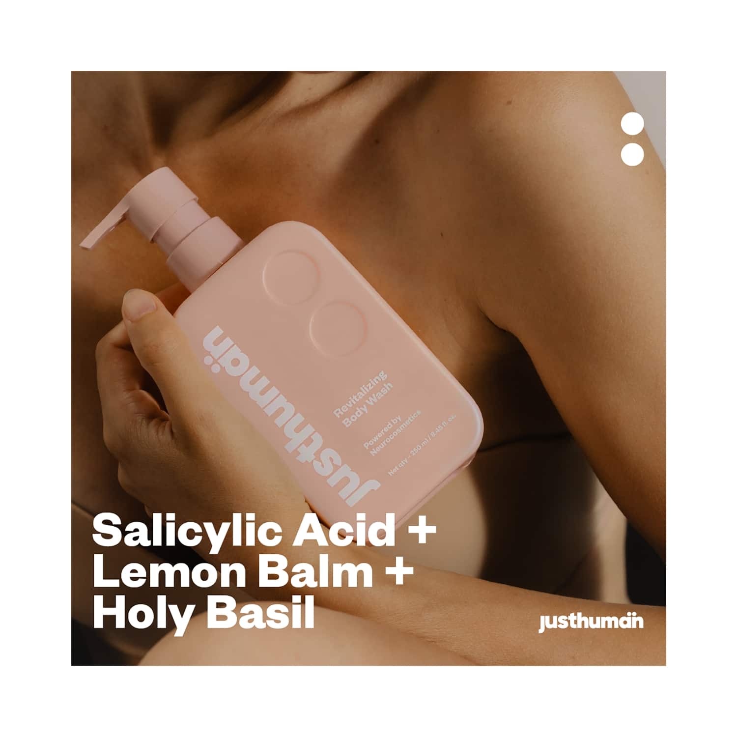 Experience the ultimate refreshment with the Justhuman Revitalising Body Wash (250ml). This brightening body wash contains salicylic acid to exfoliate and smoothen the skin while gently cleansing it. Also, this Justhuman body wash has a blend of lemon balm and holy basil to invigorate the skin and your senses.