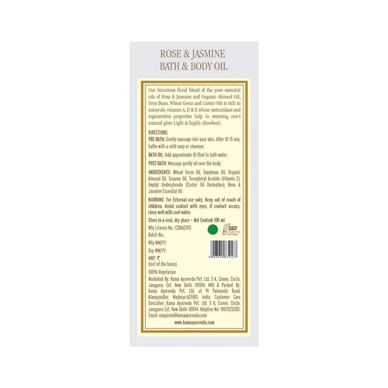 Indulge in a wholesome experience with the Kama Ayurveda Rose Jasmine Bath And Body Oil - (100ml). This floral oil blend is infused with organic almond oil, soybean, wheat germ, castor oils, and pure essential oils of rose and jasmine that nourish the skin. The solution's antioxidant and regenerative qualities aid in restoring the skin's natural radiance. In addition, the lightweight oil gets quickly absorbed and stays all day long.Key Features & Benefits:Enriched with organic almond oil, soybean, wheat germ, castor oils, and pure essential oils of rose and jasmine for nourishing the skinActs as an antioxidant and has regenerative propertiesLightweight oil gets quickly absorbed in the skin and stays all day longBath and body oil aids in restoring the skin's natural glowKey Ingredients:Wheat germ oil: Makes skin soft and suppleCastor oil: Promotes good skin healthJasmine oil: Antiseptic and AntidepressantRose oil: Helps in stress reductionHow to Use:Before taking a bath, gently massage the oil into your skin and let it sit for 10 to 15 minutes before rinsing with a mild body cleanser. For a relaxing bath, add approximately 10 to 15 ml of bath oil to the water. After bathing, apply a suitable amount to your palms and gently massage your entire body.About the Brand:Launched in 2002, Kama Ayurveda has been a sought-after Indian brand providing beauty and wellness products all over the globe. Initially, they introduced 9 Ayurvedic treatments in collaboration with the well-known Arya Vaidya Pharmacy from Coimbatore, Tamil Nadu. Over the years, Kama Ayurveda has grown and spread authentic Ayurvedic treatments worldwide. All their beauty and wellness products are manufactured with natural ingredients and efficacious formulations to provide long-term skincare results to the customers.Check out more KAMA Ayurveda Massage Oil options here, or browse through tokocart's full range of Massage Oil from top global brands.You can also explore other products from the world of KAMA Ayurveda here on tokocart.