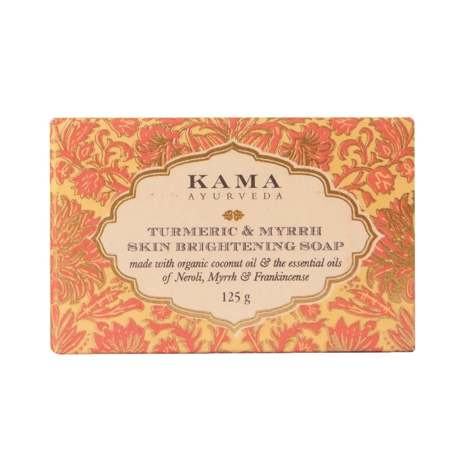 Get clear skin with the Kama Ayurveda Turmeric And Myrrh Skin Brightening Soap - (125g). This turmeric, myrrh-infused face and body soap lightens skin, lessens pigmentation, and keeps it soft and glowing. A potent anti-inflammatory, antibacterial, and antioxidant, it purifies the skin and heals blemishes. In addition, the moisturising soap instantly hydrates your skin and soothes it.Key Features & Benefits:Enriched with turmeric, myrrh, and neroli for brightening the skinMoisturising soap removes dead skin cells and purifies skinConsists of natural antioxidants for correcting hyperpigmentation and dark spotsHydrating soap repairs damaged skinRefreshes and soothes the skin after every useKey Ingredients:Turmeric oil: Provides glow and lustre to the skinCoconut oil: Clears up skin irritation and itchingBeeswax: Hydrates the skinNeroli: Acts as an antioxidant for skinHow to Use:Wet Skin With Warm Water; Gently Apply The Soap And Rinse.About the Brand:Launched in 2002, Kama Ayurveda has been a sought-after Indian brand providing beauty and wellness products all over the globe. Initially, they introduced 9 Ayurvedic treatments in collaboration with the well-known Arya Vaidya Pharmacy from Coimbatore, Tamil Nadu. Over the years, Kama Ayurveda has grown and spread authentic Ayurvedic treatments worldwide. All their beauty and wellness products are manufactured with natural ingredients and efficacious formulations to provide long-term skincare results to the customers.Check out more KAMA Ayurveda Soaps options here, or browse through tokocart's full range of Soaps from top global brands.You can also explore other products from the world of KAMA Ayurveda here on tokocart.