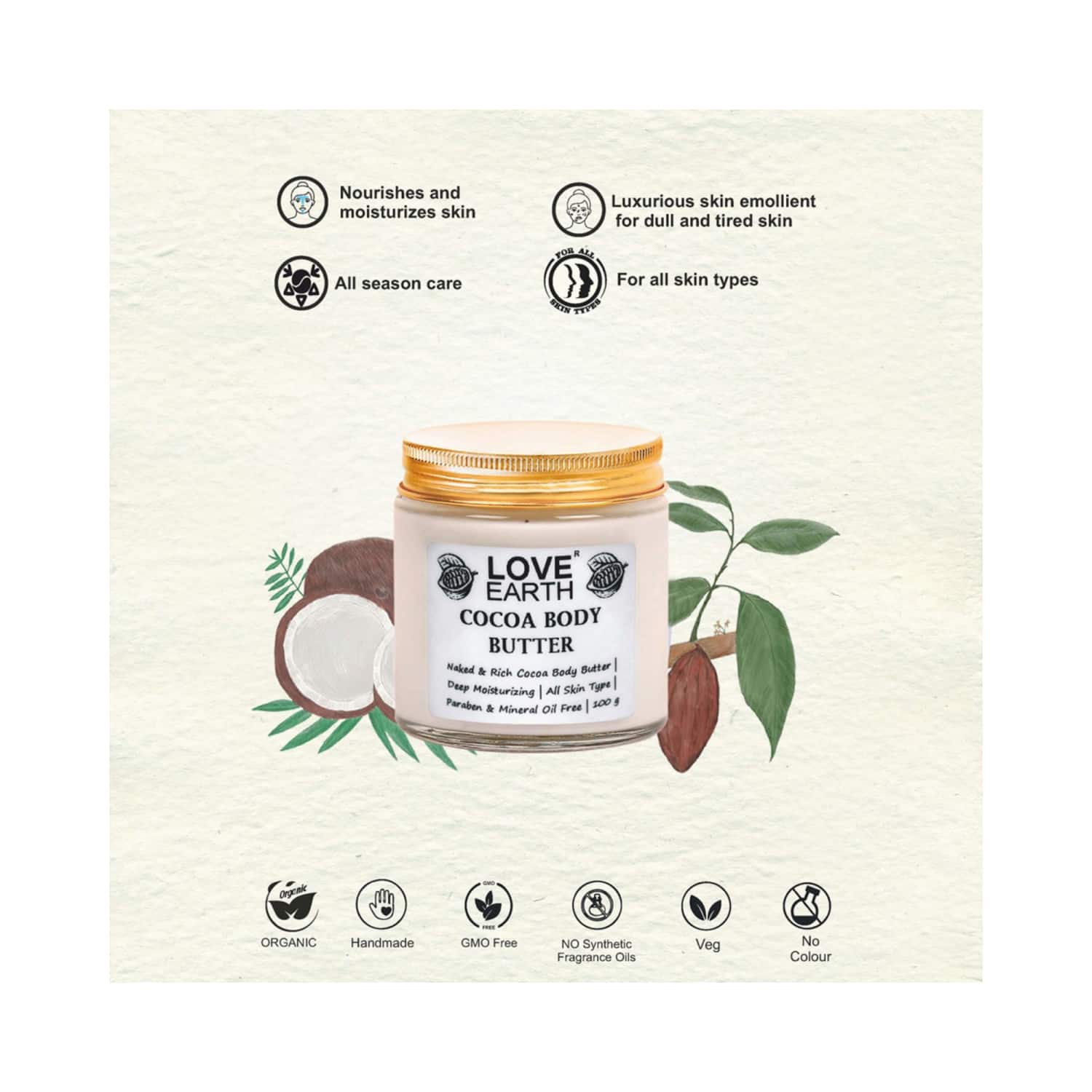For skin that is lifeless and exhausted, the Love Earth Cocoa Body Butter (100g) is a delightful skin emollient. This body butter deeply nourishes and moisturizes the skin because it is loaded with the beneficial properties of pure cocoa butter. Argan oil, caramel, and vitamin E are combined into this incredibly nourishing cocoa body butter for extra nourishment. The best skin care for smooth, supple skin in all seasons.Key Features & Benefits:Body butter gives your skin wonderful nutrientsEnriched with vitamin E, caramel, and argan oil for smooth skinRich solution rejuvenates dry, flaky skin and keeps it moisturized throughout the yearKeeps skin hydrated for long hoursKey Ingredients:Cocoa: Improves blood flow to skinVitamin E: Hydrates the skinAll Ingredients:Shea Butter, Cocoa, Butter, Mango, Butter, Almond, Oil, Castor, Oil, Coconut, Oil, Vitamin-E, Oil, Sodium, Gluconate, Ethylhexylglycerin, And, Phenoxyethanol, Fragrance/Essential, Oils.How to Use:Use it after a shower or whenever your skin needs hydration and nourishment; apply it there. Allow it to absorb after giving it a little massage.About the Brand:Love Earth is an Indian brand founded in Delhi. The brand is known to source the greatest goods from the best suppliers for the customers at the most competitive pricing. The goal is to ensure the best skin care possible through the vast range of products they offer, from the hand-selected tea leaves in teas to the natural organic ingredients included in their skin care products. In addition to the fact that they are fundamentally organic, we are pleased to announce that we possess all of the top licenses and certifications available for safe and cruelty-free products.Check out more Love Earth Body Butters options here, or browse through tokocart's full range of Body Butters from top global brands.You can also explore other products from the world of Love Earth here on tokocart.
