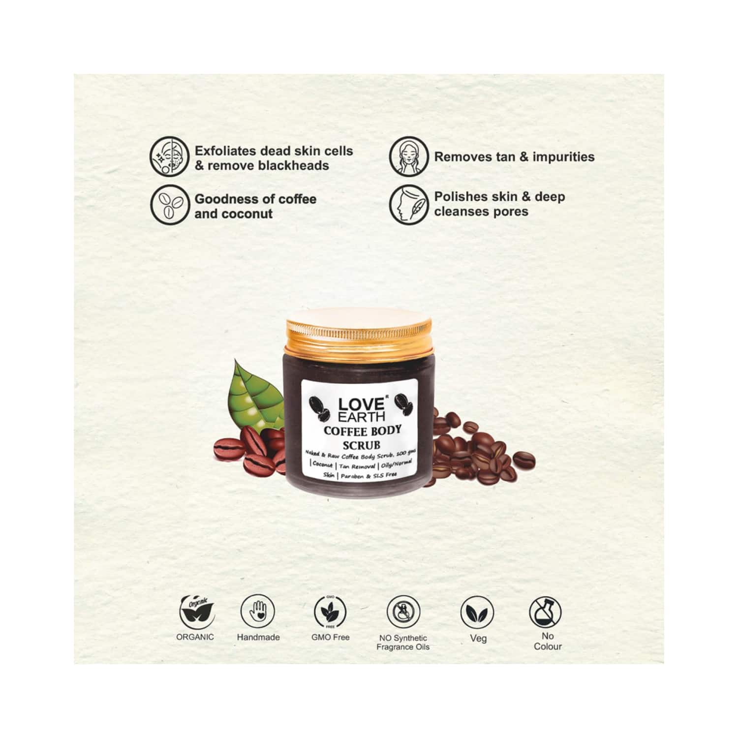 Boost your skin's brightness with the Love Earth Coffee Body Scrub (100g). Pure Arabica coffee and cold-pressed coconut oil are used to make this body scrub. The scrub helps remove blackheads, tan, and pollutants by exfoliating dead skin cells. Your skin will be smooth, luminous, and free when it polishes the skin and thoroughly cleans the pores. Despite being gentle on your skin, the properly sized raw coffee particles are incredibly powerful. Unlike other body washes, this one helps the skin retain moisture to keep it hydrated and nourished without drying it off.Key Features & Benefits:Luxurious body scrub gently removes all impurities and dead skin cells and reveals clean, tan-free skinRemoves debris and grime from the skin to reveal clear, vibrant skinMakes skin more elastic, flexible, and youthful-lookingCoffee granules are gentle on the skin and do not cause it to become dry after applicationKey Ingredients:Coffee: Exfoliates skinShea butter: Nourishes skinVitamin E: Hydrates skinAll Ingredients:Coffee, Flavour, Vitamin-E, Coconut, Oil, Shea Butter, Ethyl, Hexyl, Glycerin, And, Phenoxyethanol, Fragrance/Essential, OilsHow to Use:Apply the scrub in sufficient amounts to a moist body, starting at the shoulders and working down the arms and legs. Don't make contact with your eyes at all. Spend a few minutes gently exfoliating in circular motions, paying special attention to the knees, elbows, and neck. Use warm water to rinse. To calm and shut the open pores, pat dry before applying body lotion or body butter.About the Brand:Love Earth is an Indian brand founded in Delhi. The brand is known to source the greatest goods from the best suppliers for the customers at the most competitive pricing. The goal is to ensure the best skin care possible through the vast range of products they offer, from the hand-selected tea leaves in teas to the natural organic ingredients included in their skin care products. In addition to the fact that they are fundamentally organic, we are pleased to announce that we possess all of the top licenses and certifications available for safe and cruelty-free products.Check out more Love Earth Body Scrubs & Exfoliants options here, or browse through tokocart's full range of Body Scrubs & Exfoliants from top global brands.You can also explore other products from the world of Love Earth here on tokocart.